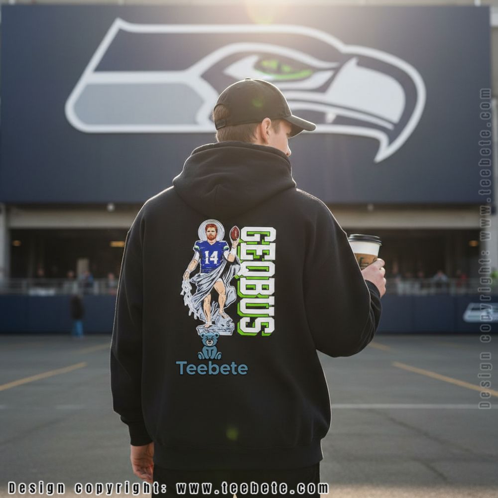 This tribute design celebrates a quarterback’s journey with a creative twist that fans will immediately recognize. The front features player imagery in the number 14 jersey alongside “GEOBUS” text in bold green lettering, referencing the nickname embraced by supporters. The artistic illustration style combines action poses with playful graphics that capture both athletic prowess and fan culture humor.