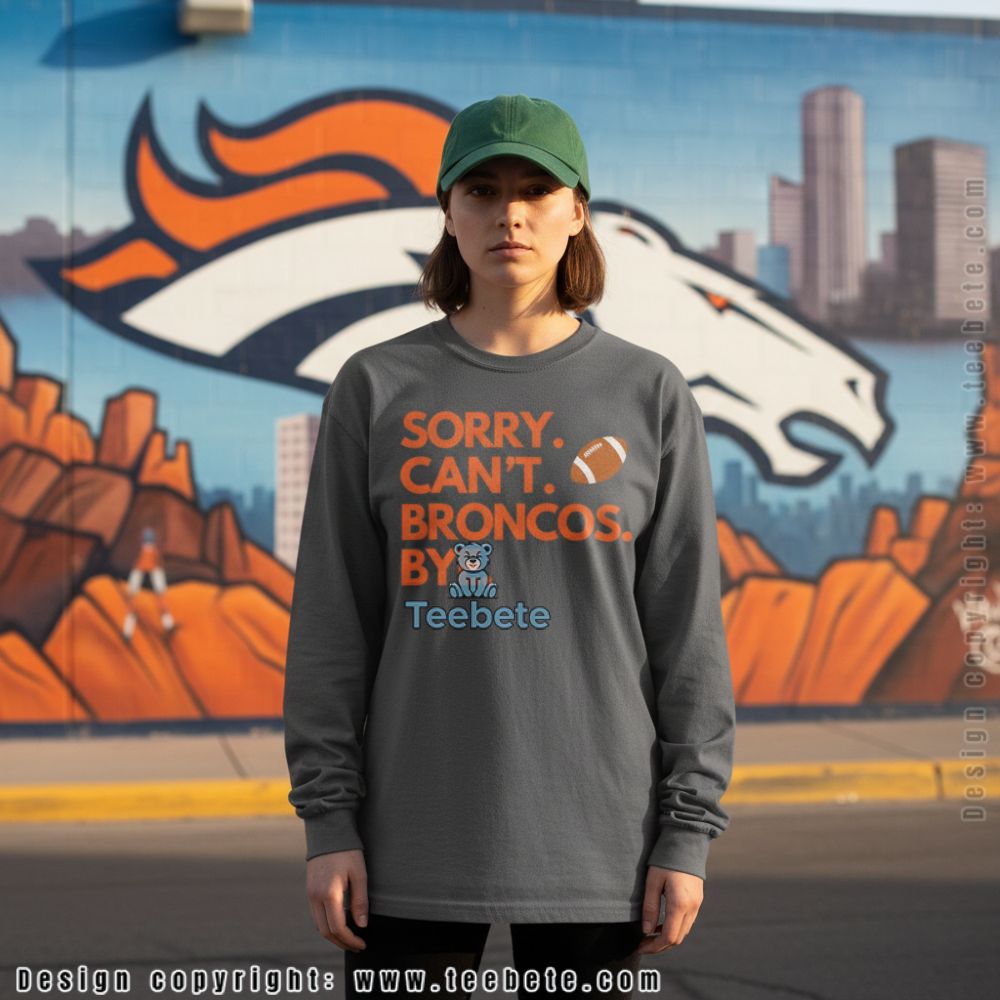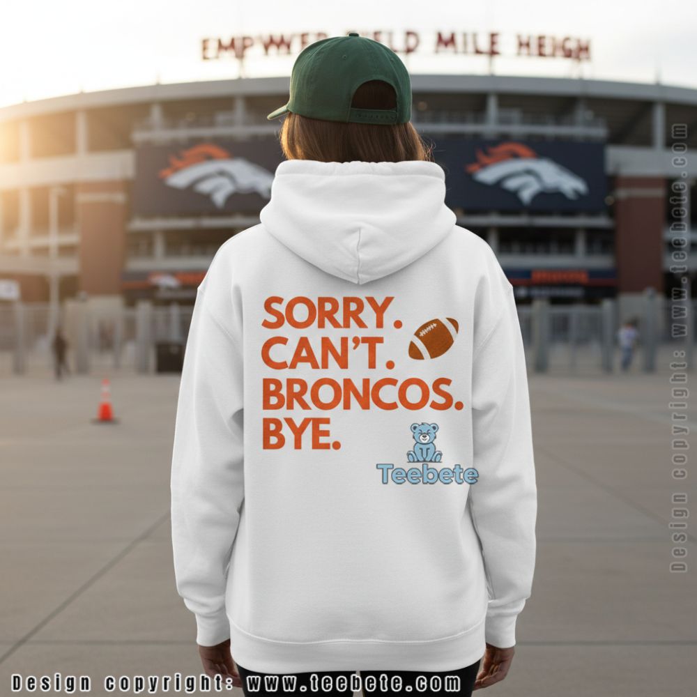 When Sunday rolls around and your social calendar suddenly clears itself, you need a shirt that speaks for you. This navy blue masterpiece delivers your message in bold orange letters that command attention: “SORRY. CAN’T. BRONCOS. BYE.” Short. Direct. Unapologetic. Because true Denver Broncos fans don’t negotiate when game day calls.