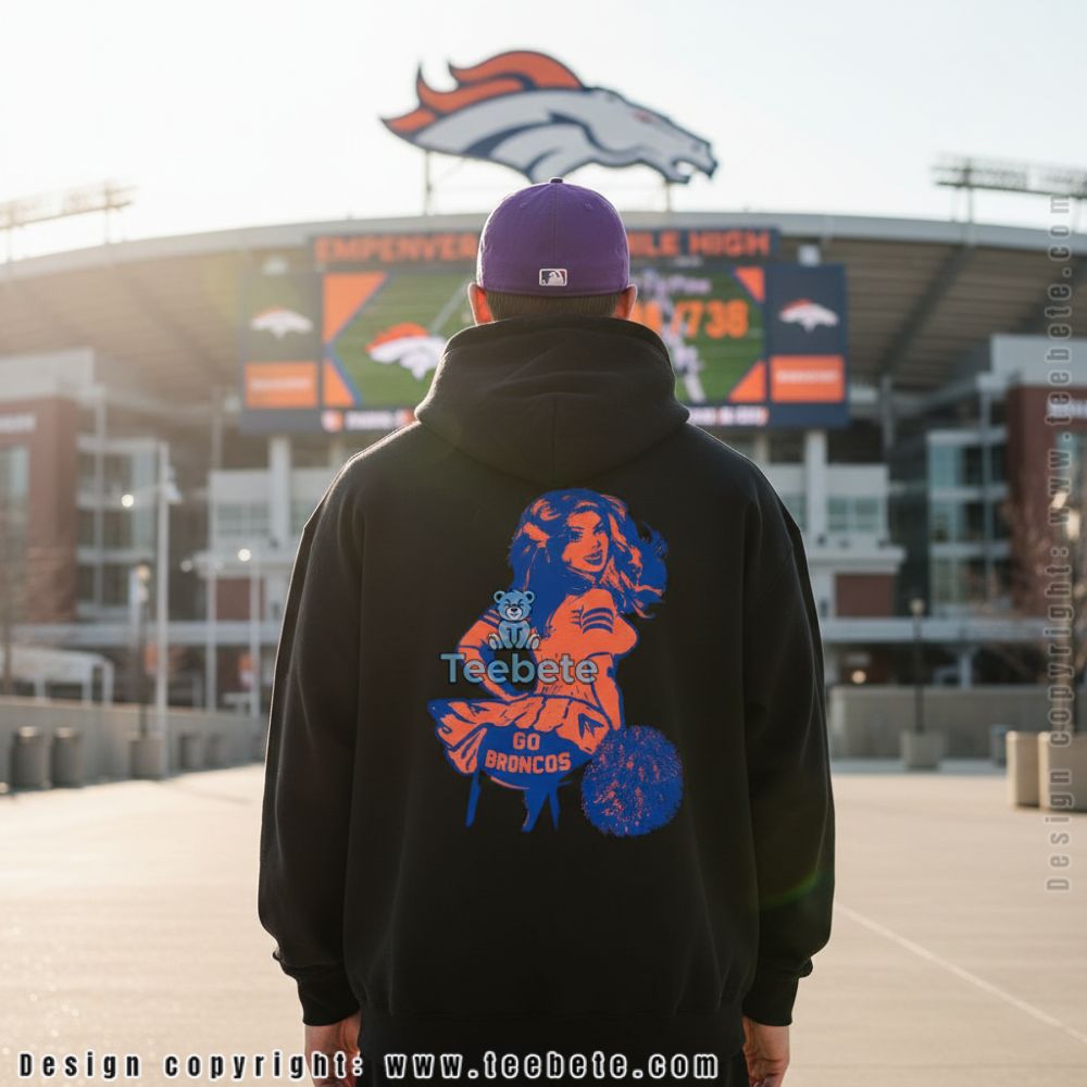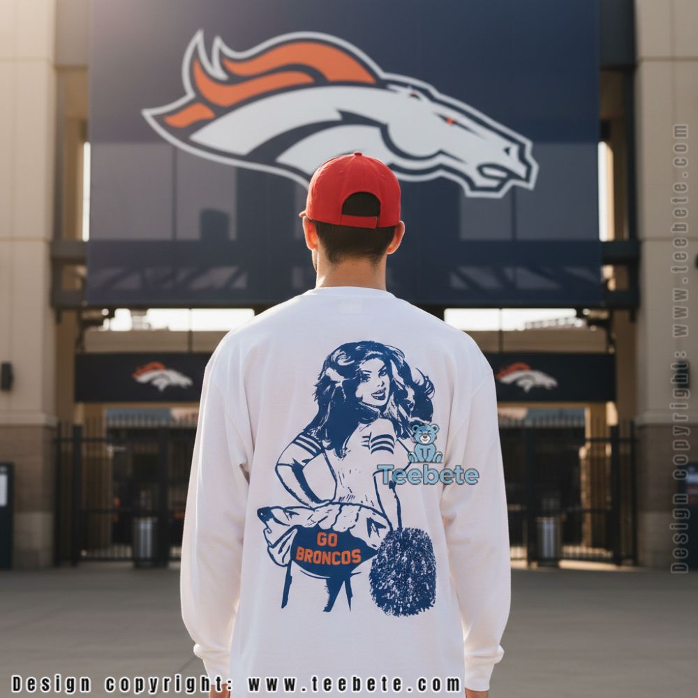 This vintage-inspired design brings retro charm to modern game day style with a pin-up cheerleader illustration and “GO BRONCOS” text. The front print features bold navy graphics against vibrant orange fabric, creating eye-catching contrast that celebrates team spirit with a throwback twist. It’s perfect for fans who want their game day wardrobe to stand out from the crowd.