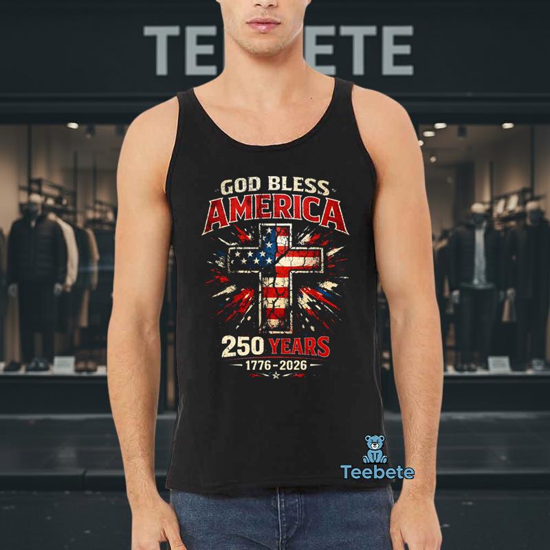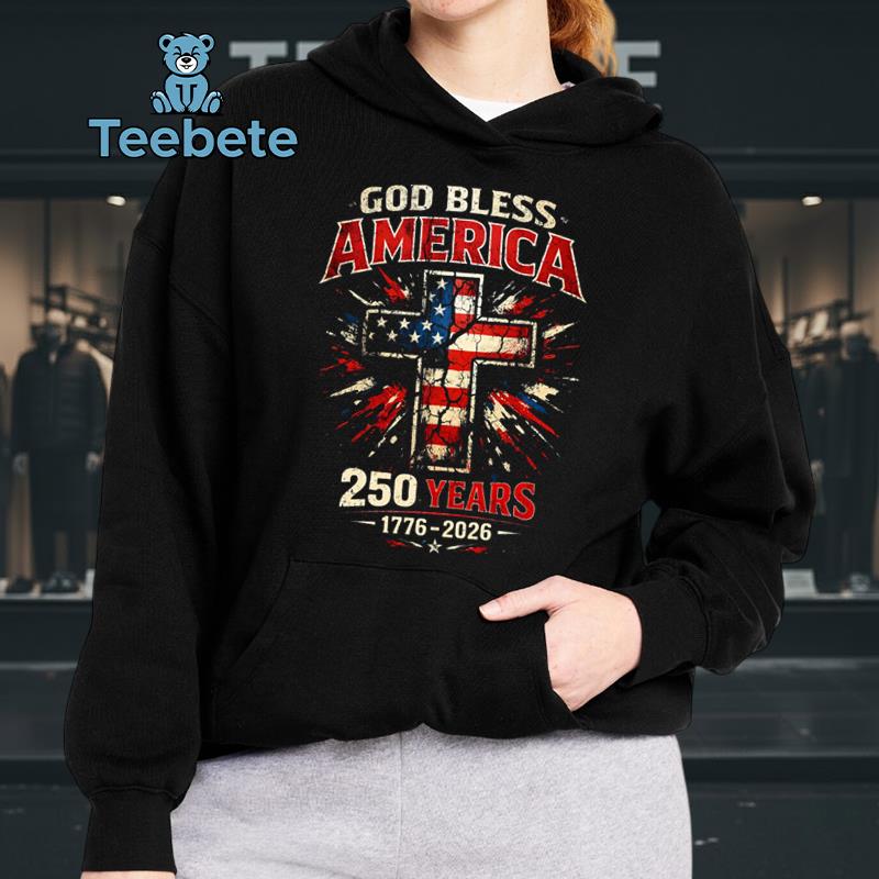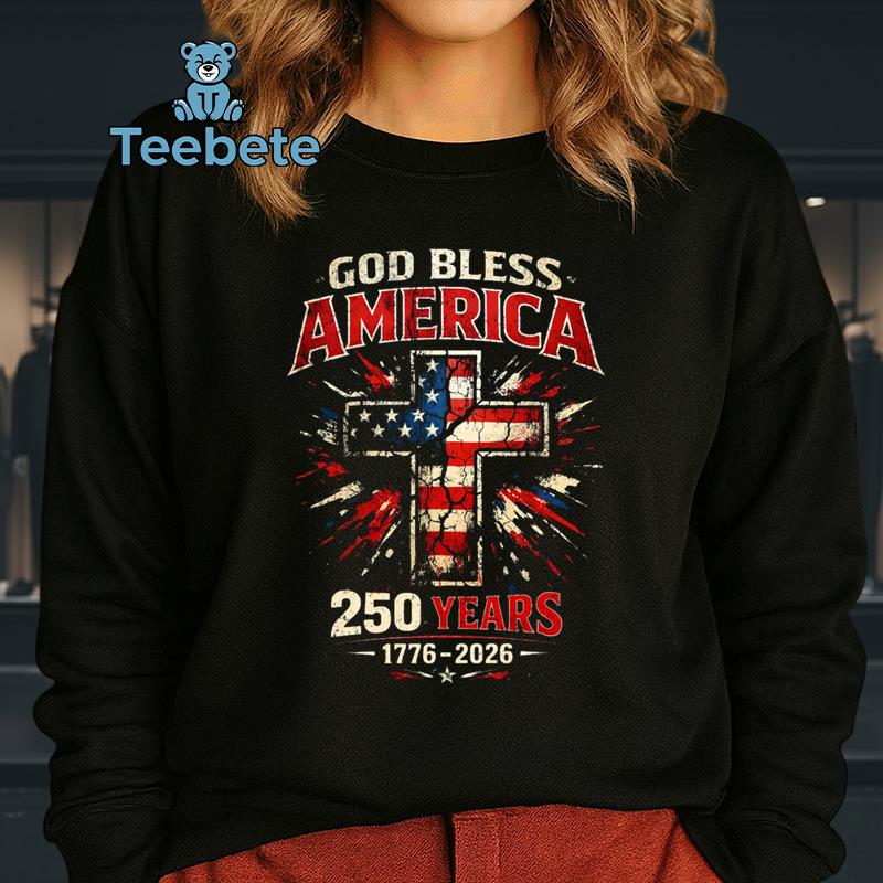 The intricate design of the God Bless America 250 Years 1776-2026 Cross Flag Patriotic Tee captivates onlookers with its powerful visual symphony. Saturated hues of red, white, and blue blend seamlessly against the backdrop, while a large, central graphic featuring an iconic cross-flag motif boldly communicates the theme of patriotism. Surrounding this centerpiece, dynamic typography boldly spells out “God Bless America,” enhancing the festive spirit. The full-coverage print effectively captures the essence of celebration, ensuring every detail is visible from any angle, making it a standout Patriotic America T-Shirt.