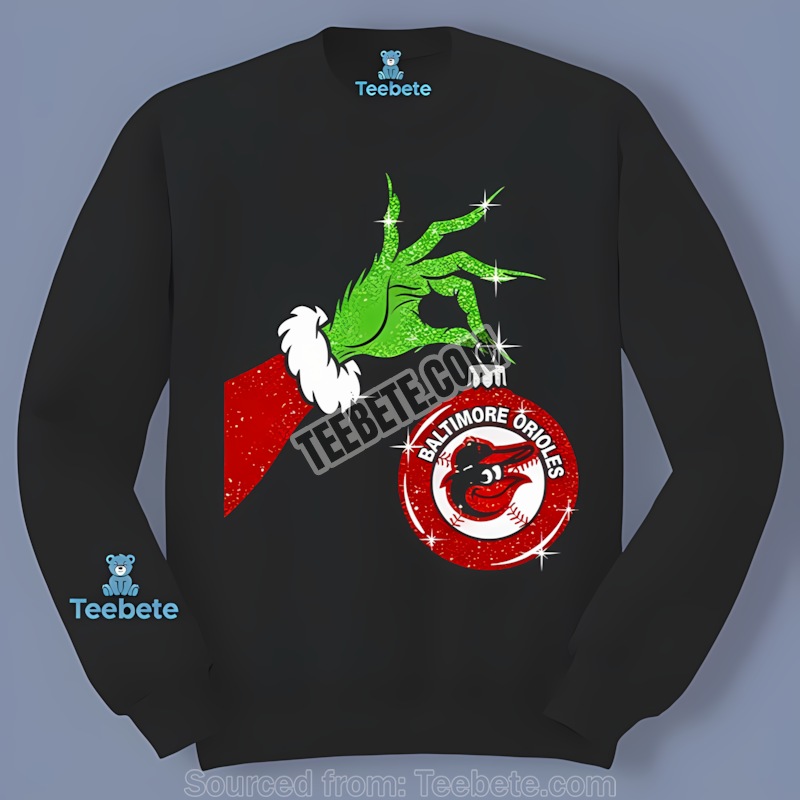 Don’t miss out on this unique blend of holiday spirit and baseball fandom! Order your Grinch Hand Holding Baltimore Orioles Ornament Adults Shirt from Teebete today and show your team spirit in a delightfully unexpected way.