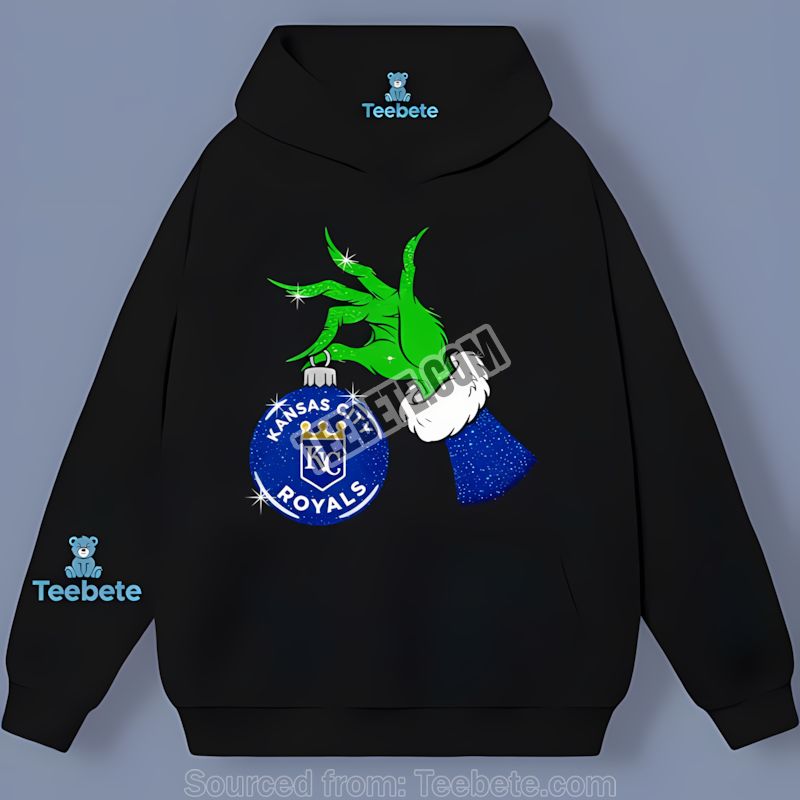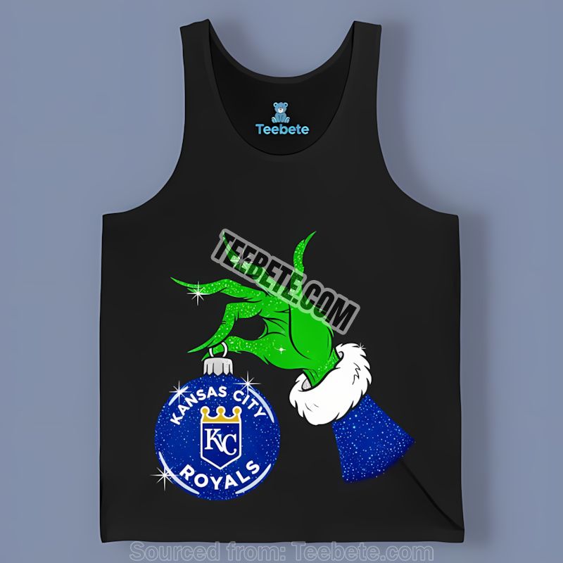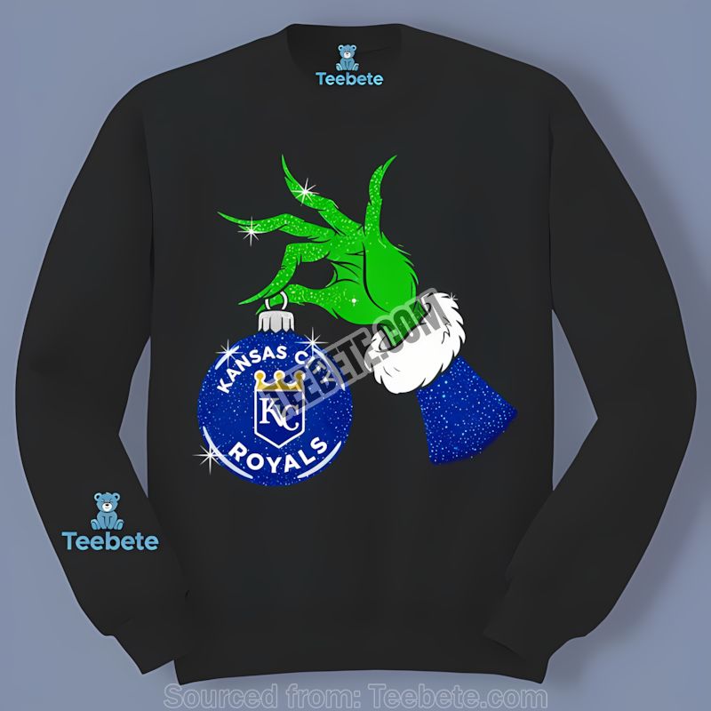 Don’t miss out on this unique and festive design. Order your Teebete Grinch Hand Holding Kansas City Royals Ornament Graphic Shirt today!