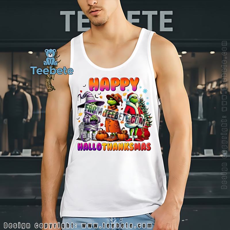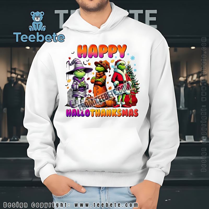 The Grinch Happy Hallothanksmas Shirt Three Holidays In One merges the joyful essence of Christmas, the spooky fun of Halloween, and the gratitude of Thanksgiving. Embrace the festive spirit with this unique design that celebrates the best of all three holidays. It’s a delightful way to show your love for the season and engage in cheerful festivities.