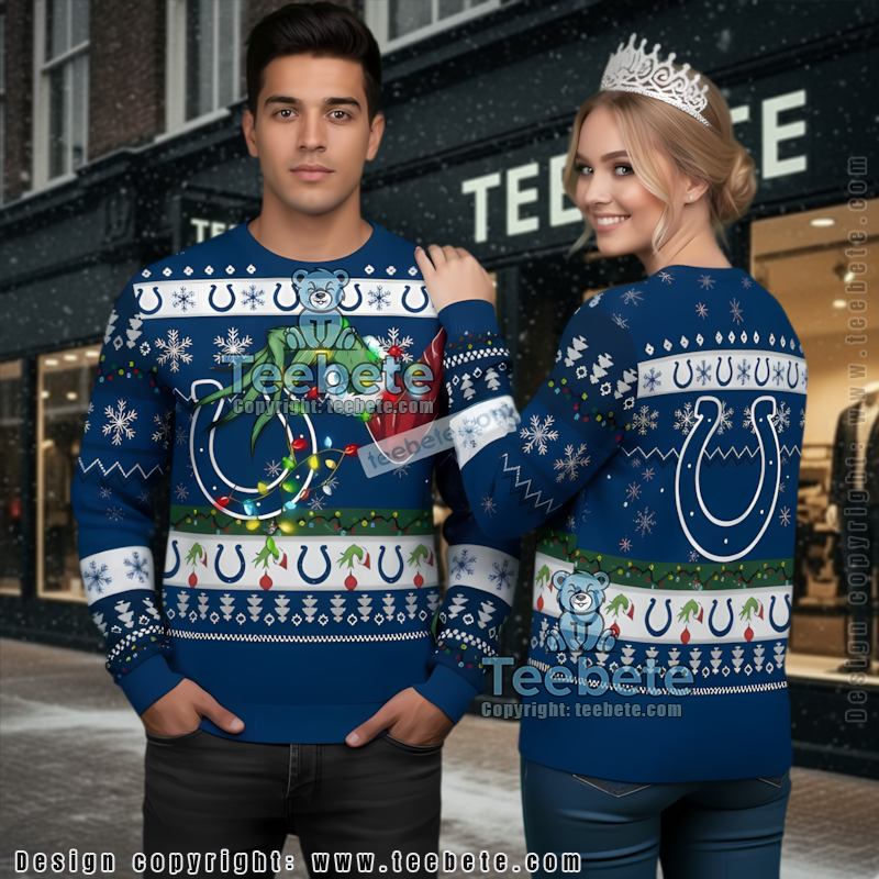 Designed for comfort and versatility, the Indianapolis Colts Grinch Xmas Light Cheap Ugly Christmas Sweater Blue ensures you not only look good but feel great too. Made by Teebete, this sweater provides a cozy fit that can be layered or worn over your favorite Colts gear. Your holiday parties and family gatherings will be brighter with this appealing apparel.