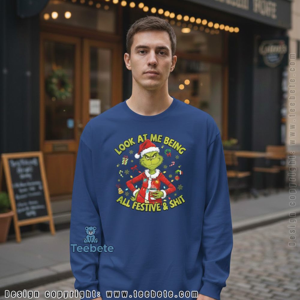 Crafted from high-quality cotton, the Grinch Look At Me Being All Festive Shirt guarantees a soft, breathable fit. It’s easy to care for, so you can wear it multiple times throughout the season without missing a beat. Pair it with jeans or festive pants for a laid-back, cheerful look.
