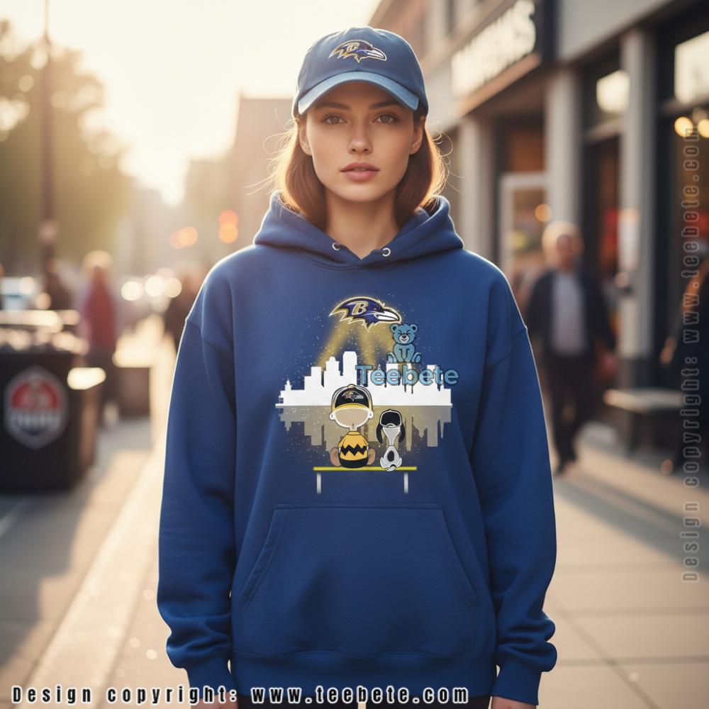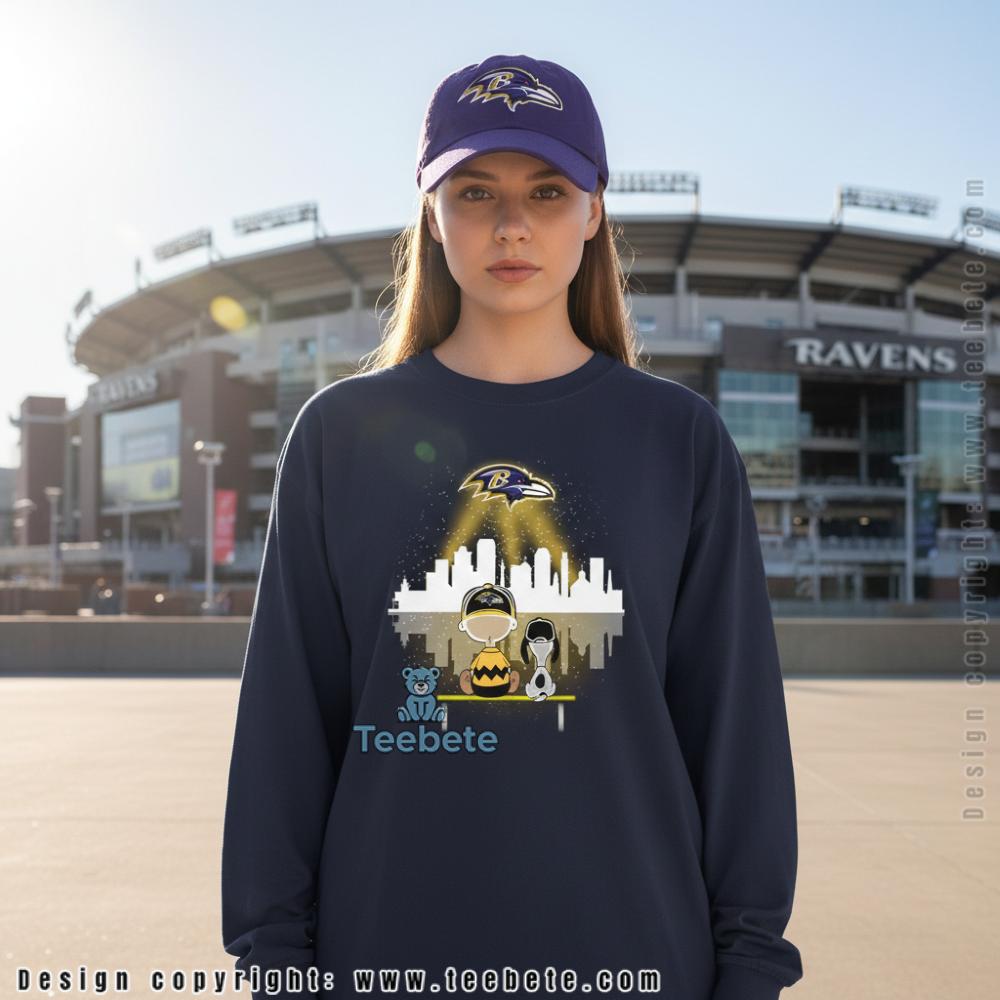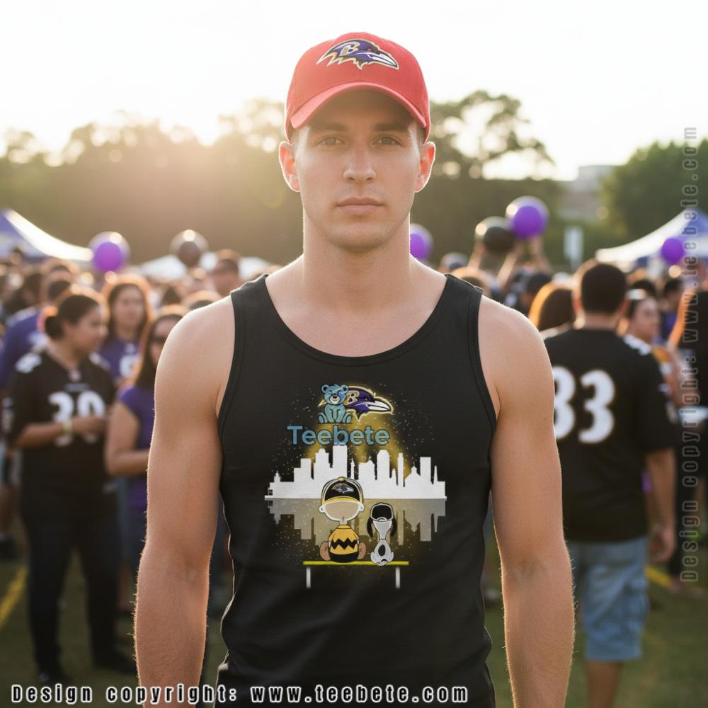 The blend of beloved childhood characters with hometown pride creates universal appeal for multi-generational Ravens supporters who grew up with Charlie Brown specials. Perfect for Halloween game days, autumn festivities, or casual wear celebrating Baltimore identity, this design bridges Peanuts nostalgia with local team loyalty. The artistic skyline backdrop adds sophisticated city pride element beyond typical sports graphics, offering Flock members a heartwarming way to showcase both their love for timeless animation and their Ravens devotion through charming character integration with Baltimore landmarks.