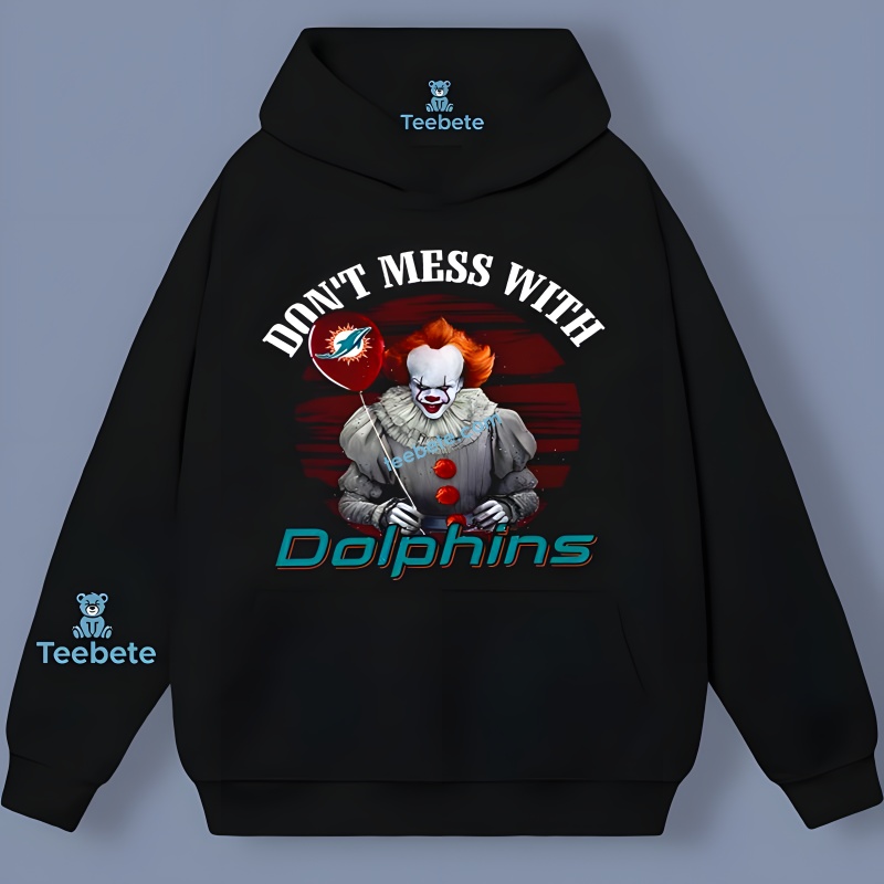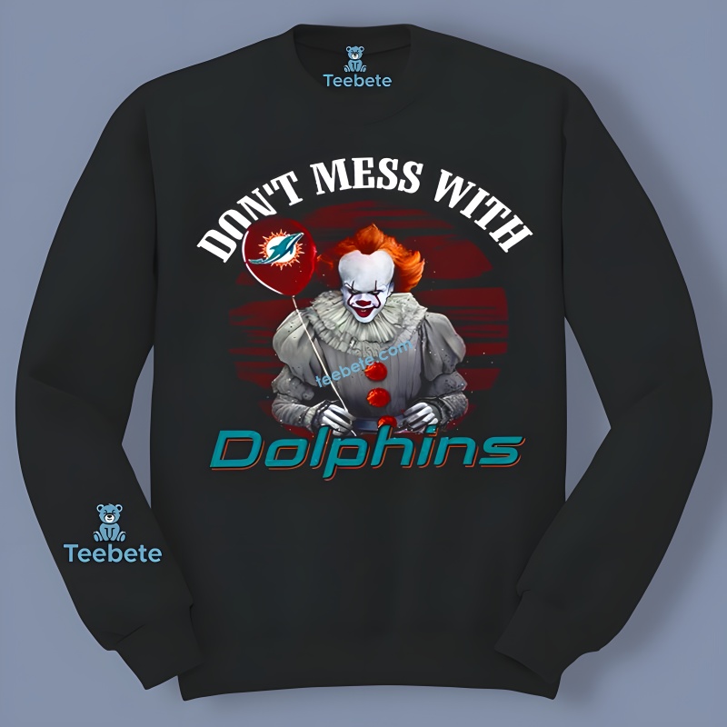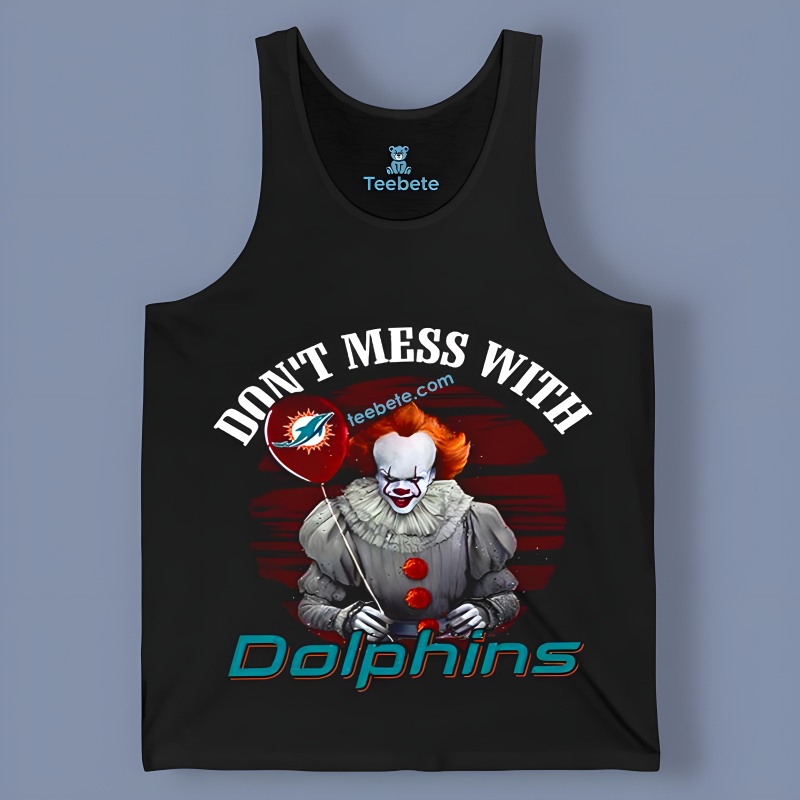 Unleash your inner Fins fanatic this Halloween with the ultimate fusion of fright and football: the Halloween Dont Mess With The Miami Dolphins Pennywise Shirt by Teebete.