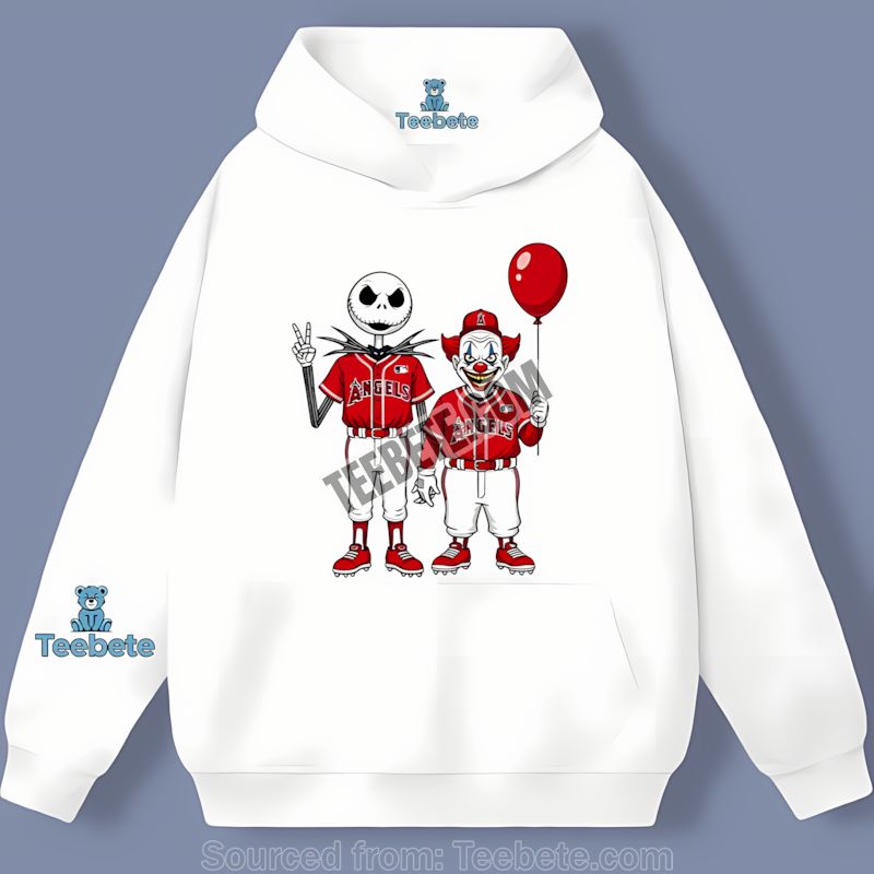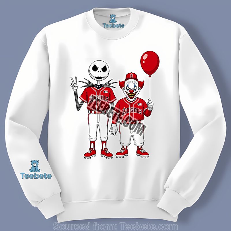 The idea for this shirt came from a late-night brainstorming session between our design team. Inspired by the iconic imagery of Tim Burton’s *Nightmare Before Christmas* and Stephen King’s *IT*, we wanted to create something that captured the thrill of both Halloween and baseball fandom. The result? A chillingly cool mashup of Jack Skellington and Pennywise, sporting classic Angels colours, a perfect blend for any dedicated fan with a spooky side.