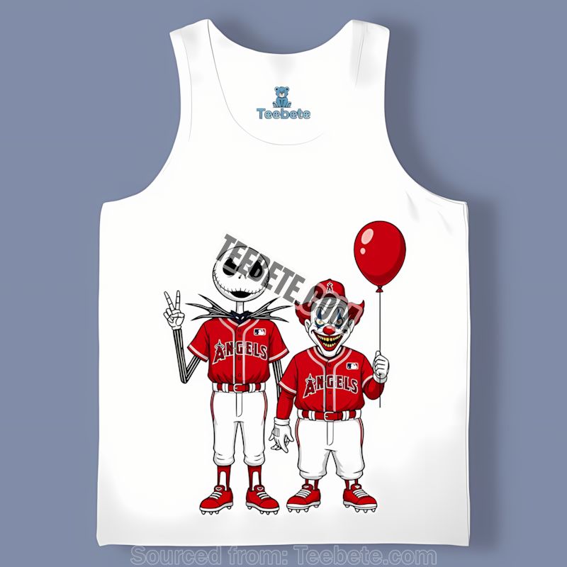 The detailed design, featuring Jack Skellington’s signature grin intertwined with Pennywise’s menacing clown face, set against the Angels’ iconic red and white, is a conversation starter guaranteed to turn heads. Show your devotion to your team with a truly unique and unexpected twist. It’s the ultimate combination of fright and fandom.