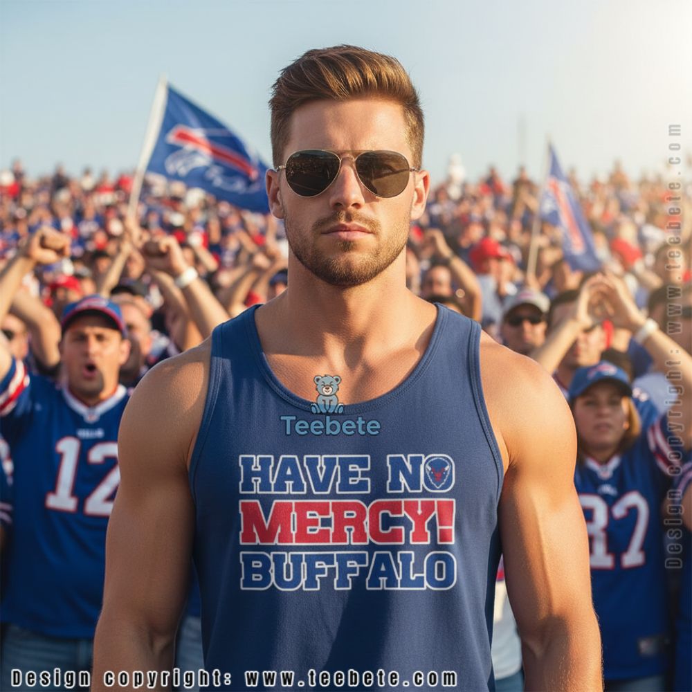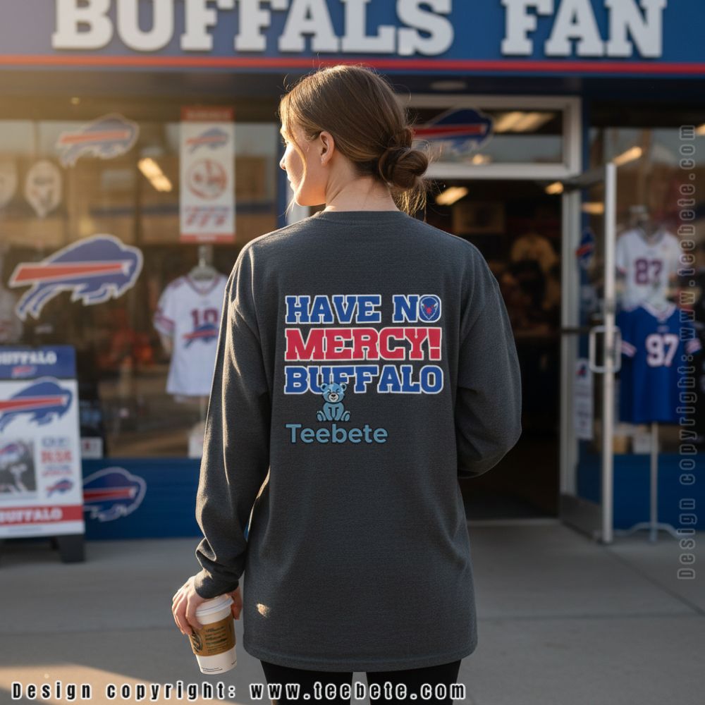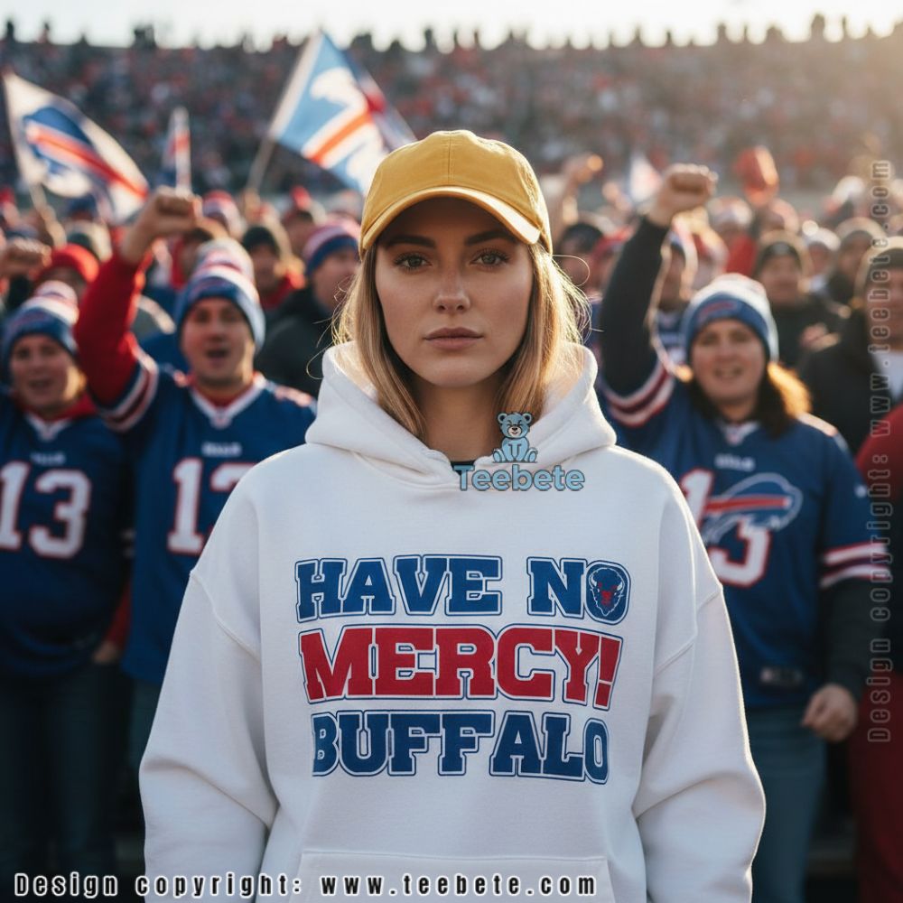 Combining elements of humor and style, the Have No Mercy Buffalo Funny Shirt showcases a playful illustration of a buffalo amidst a lively scene that captures attention. The full-coverage graphic blends intricate details and quirky text, set against a harmonious color palette of earthy tones juxtaposed with striking highlights. Utilizing advanced printing techniques, the design seamlessly covers the fabric, creating a visually immersive experience. This shirt stands out with its unique artwork and layered layout, promising to bring a smile to any outfit.