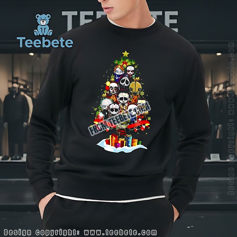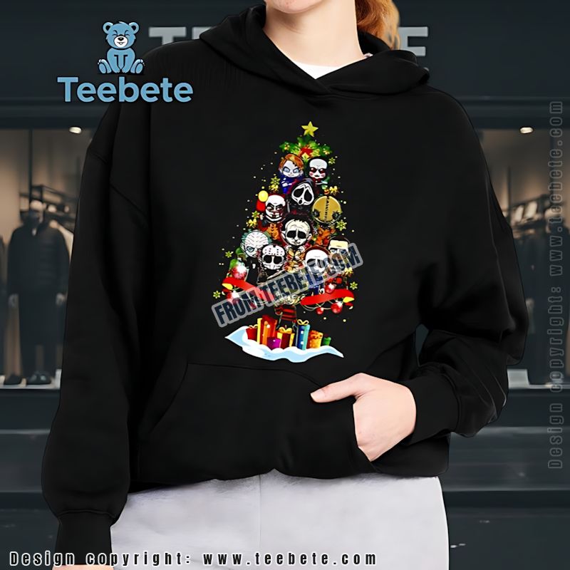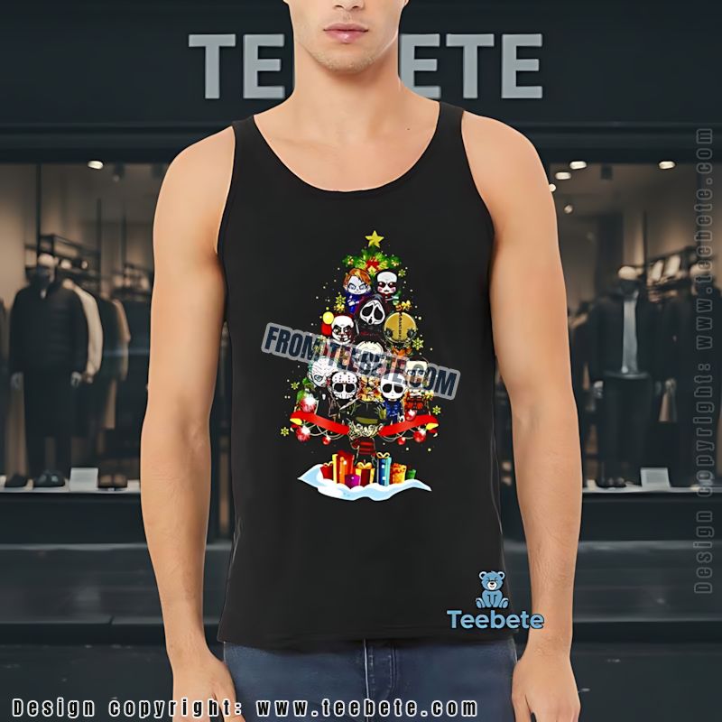 Get ready to embrace the holiday spirit with the Horror Movie Killers Christmas Tree Graphic Shirt. This unique design blends your love for the season with your favorite horror legends, making it a must-have for every fan. Celebrate this festive time in style while showcasing your passion for classic thrillers with this eye-catching tee.