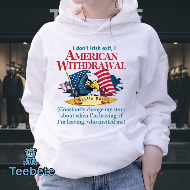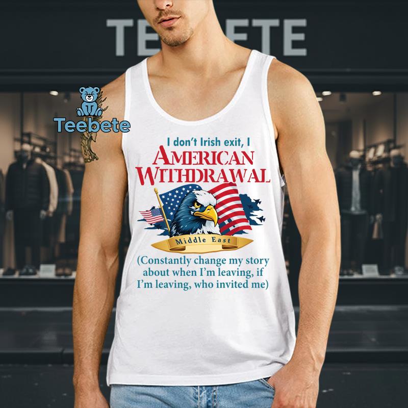 Across the canvas of this T-Shirt, a humorous yet poignant message unfurls, encapsulating an American spirit with a playful twist. “I Don’t Irish Exit, I American Withdrawal” prominently graces the front, using a dynamic font that balances whimsy with a nod to veteran culture. The color palette merges deep navy and crisp white, creating an eye-catching contrast that enhances its patriotic vibe. This design makes the “I Don’t Irish Exit I American Withdrawal Middle East Shirt Funny Patriotic Gift For Veterans” a standout piece, effortlessly merging humor with pride.