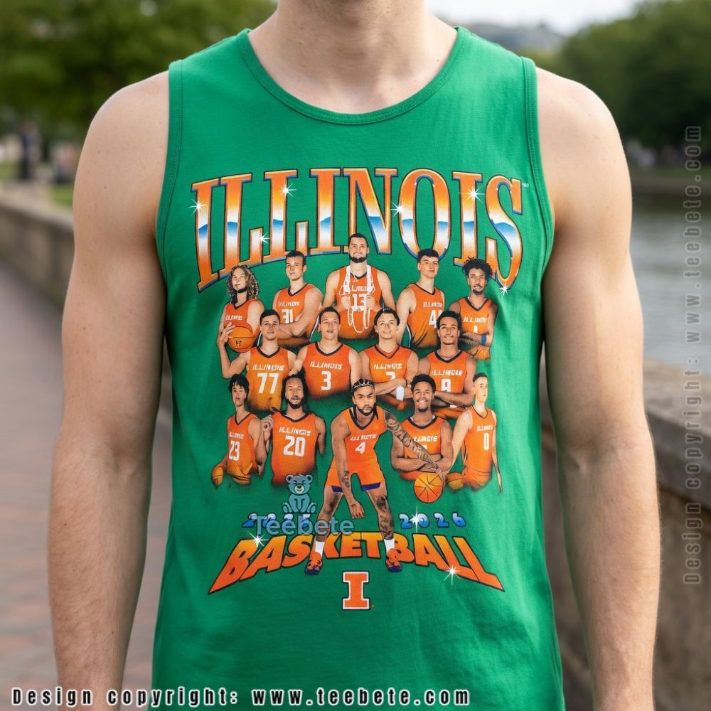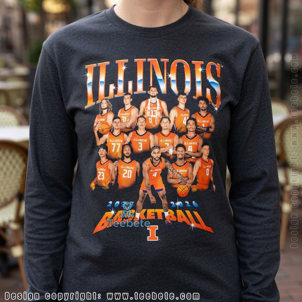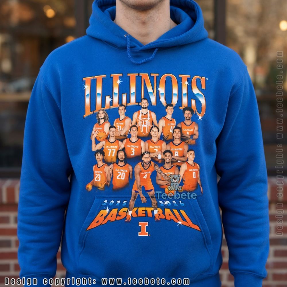 Illustrating team spirit in a striking visual arrangement, the Illinois Fighting Illini 2025-2026 Basketball Team Roster T-Shirt brings together a vibrant mix of college colors that embody the essence of the team. Centered on the front, a skillfully crafted graphic displays the names and numbers of the roster in a dynamic layout, showcasing the team’s commitment to excellence. Surrounding this centerpiece, complementary designs highlight the Fighting Illini logo, with a balanced juxtaposition of deep blues and bright orange that captures attention, making this tee perfect for any game day.