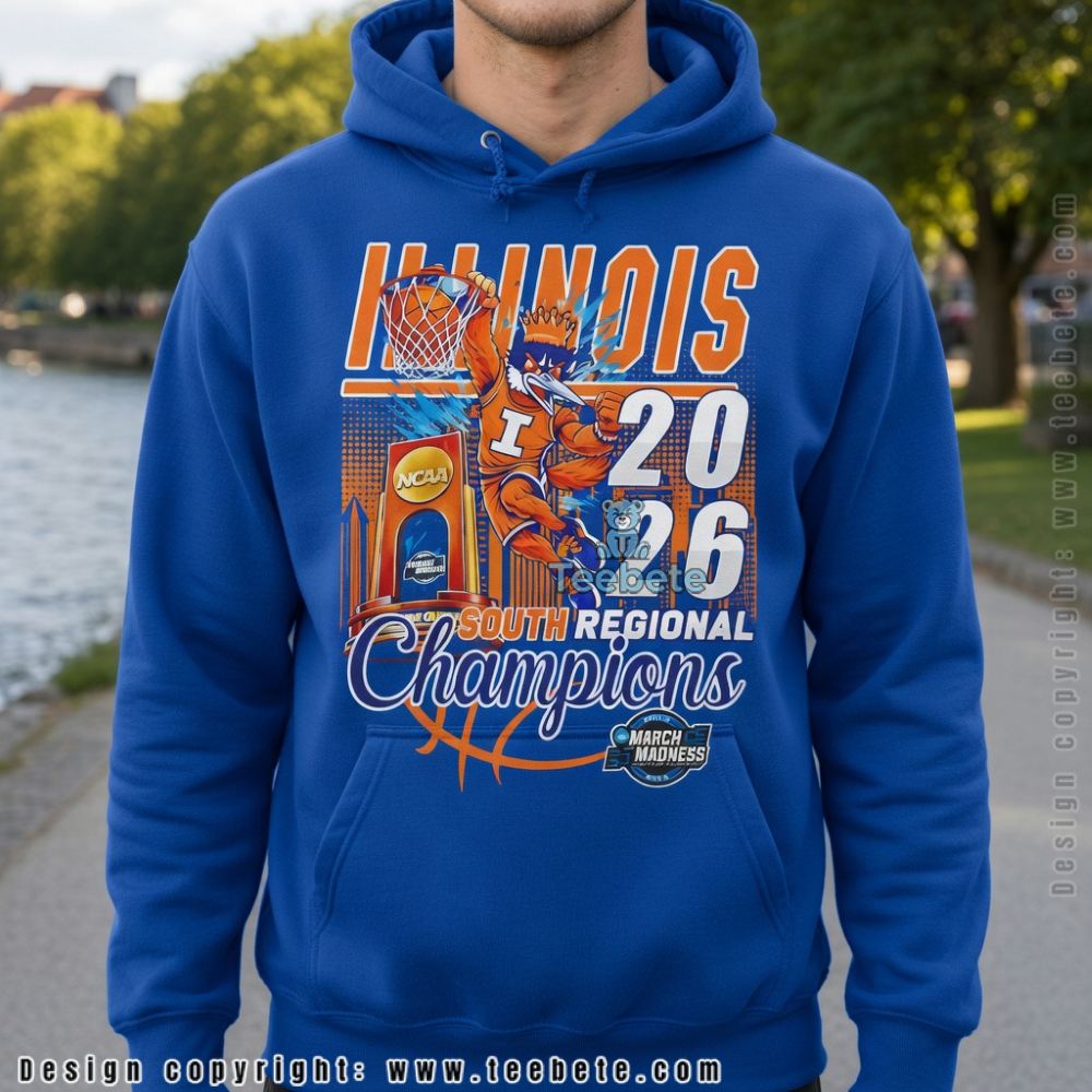 Eye-catching typography sprawls across the chest of the Illinois Fighting Illini South Regional Champions 2026 March Madness T-Shirt, delivering a striking visual statement. The design harmonizes the iconic orange and blue team colors, with a prominent display of the “2026 South Regional Champions” text arranged artistically around the Illinois Fighting Illini logo. Layered graphics create a sense of movement and excitement, while the centered composition draws the eye, making this T-shirt an immediate focal point for any basketball fan.