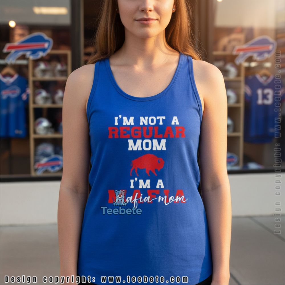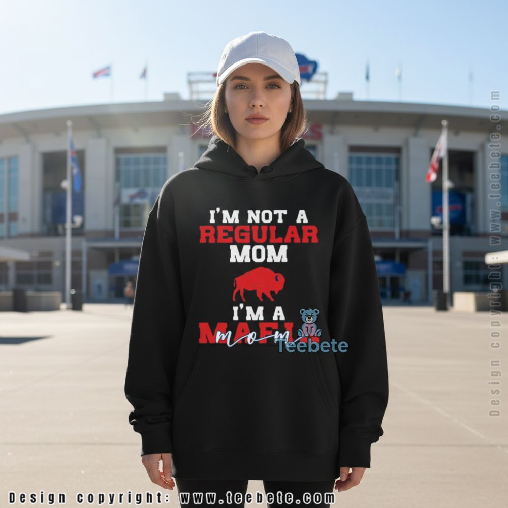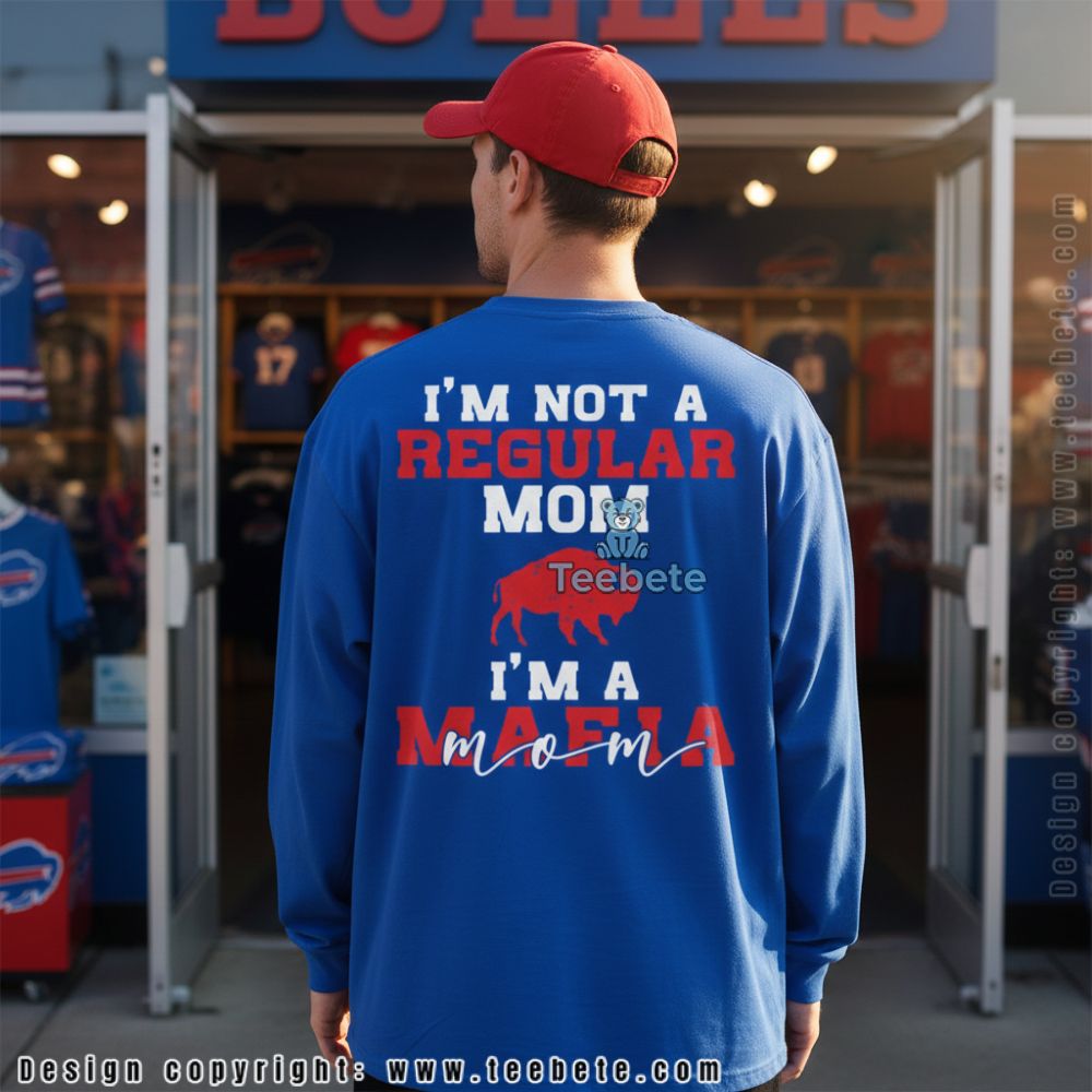 This distinct Buffalo shirt integrates an eye-catching design with clever text that reads, “I’m Not A Regular Mom I’m A Mafia Mom.” The visual layout combines playful typography with graphic accents that emphasize a tongue-in-cheek attitude. The color palette leans into classic white and black, creating a striking contrast against the shirt’s fabric. Utilizing full-coverage printing, the design wraps around seamlessly, making it an ideal addition to any casual wardrobe, while the layered text offers depth and intrigue.