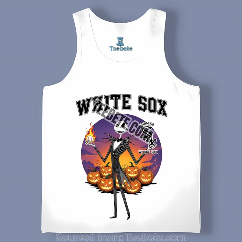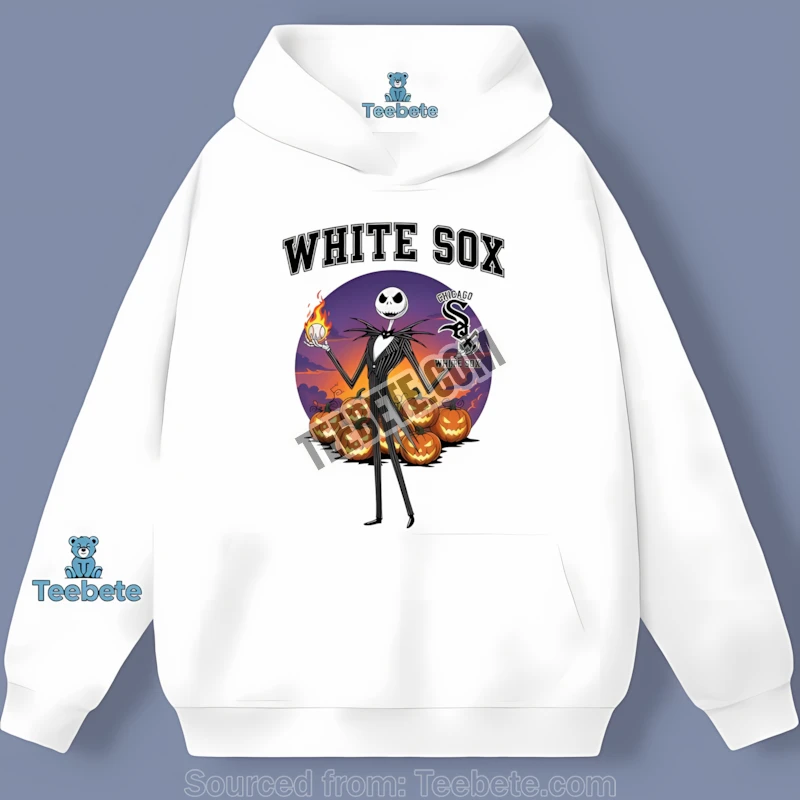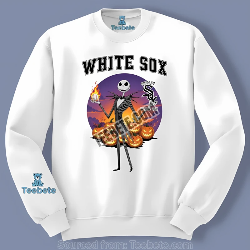 The design itself is a masterful blend of iconic imagery. Jack Skellington, the Pumpkin King himself, is depicted in a retro White Sox uniform, complete with his signature mischievous grin. The vintage-inspired color palette adds a nostalgic touch, evoking the golden age of baseball while embracing the spooky essence of Halloween. It’s a perfect piece for anyone who appreciates both the thrill of the game and the eerie delights of the Halloween season.