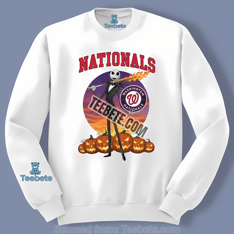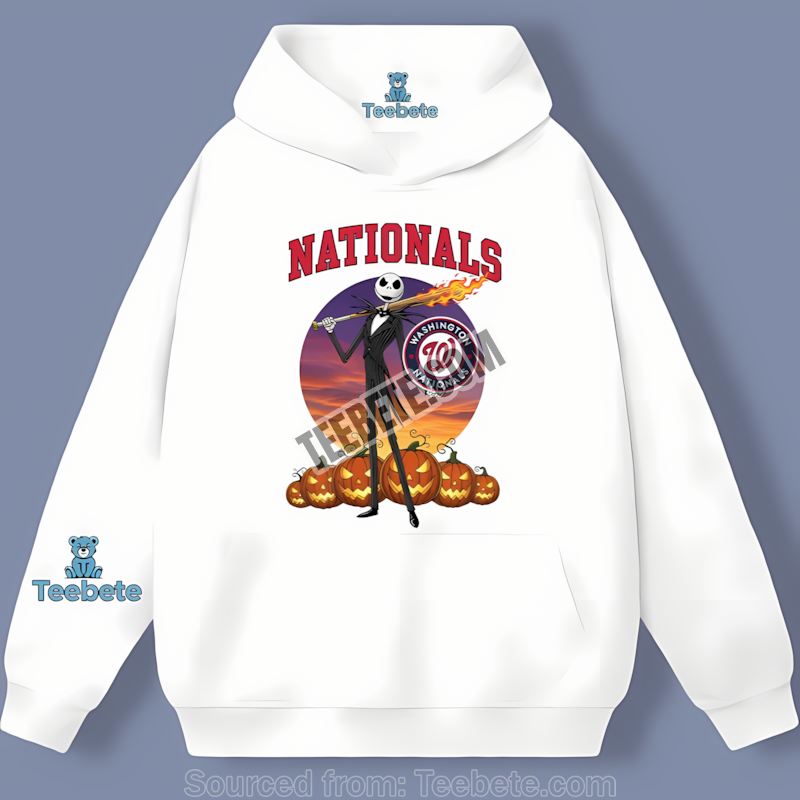 The print quality of this Washington Nationals Halloween shirt is exceptional, featuring vibrant colors and detailed graphics that showcase your fandom with pride. The design highlights the iconic Jack Skellington, set against a backdrop that fans will recognize and appreciate. Its vintage aesthetic adds a timeless touch, making it not just a seasonal favorite but a year-round wardrobe staple.