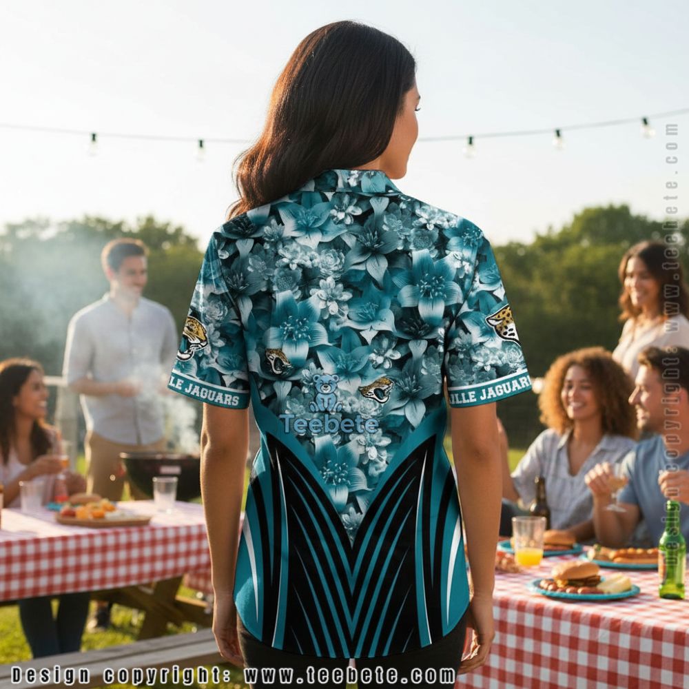 Elegant lily blossoms and hibiscus flowers in soft white and teal tones blanket the Jacksonville Jaguars Blue Lily Floral Pattern Hawaiian Shirt, creating a sophisticated botanical arrangement. The floral pattern fills the upper portion with layered petals and leaves in various shades of aqua, while Jaguars logos appear strategically placed among the blooms. Sharp geometric chevron patterns in black and teal dominate the lower section, forming bold V-shaped lines that add modern structure to the organic florals above. “JACKSONVILLE JAGUARS” text bands wrap around the sleeves, reinforcing team identity throughout. This Hawaiian shirt combines dual design aesthetics through sublimation printing on a camp collar silhouette, where the transition from delicate flowers to angular geometry creates distinct visual zones within a single garment.