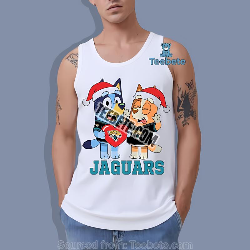 Jacksonville Jaguars Bluey And Bingo Christmas Heart Shirt pays homage to family moments and the joy of fandom. Each shirt serves not only as a stylish statement but also as a reminder of those fun, light-hearted times spent with loved ones. This design brilliantly intertwines the charm of holiday cheer with a love for the game, resonating with both young fans and the young-at-heart.