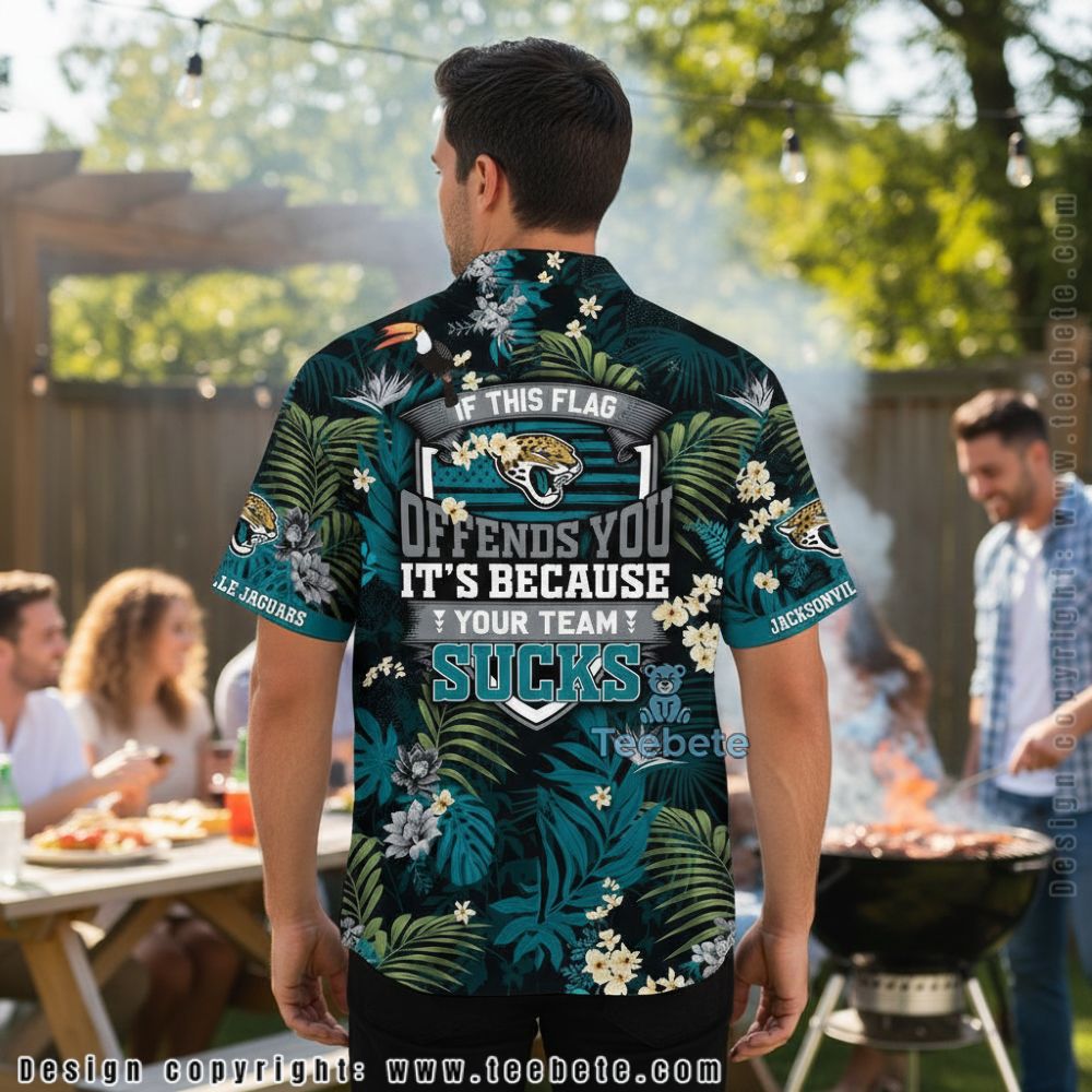 Dense jungle foliage creates a lush tropical backdrop on the Jacksonville Jaguars Sarcastic If This Flag Offends You Aloha Shirt, featuring layered palm fronds, monstera leaves, and ferns in deep teal and olive green tones. Delicate white and cream plumeria flowers scatter throughout the botanical composition, adding bright focal points against the dark forest background. Team logos appear strategically placed among the greenery on both the chest and sleeves, while “JACKSONVILLE JAGUARS” text wraps around the sleeve bands. The all-over print maintains a traditional Hawaiian aesthetic through its authentic tropical plant arrangement, utilizing sublimation printing across a camp collar button-front design. Black undertones provide depth to the layered foliage, creating dimensional contrast where lighter leaves overlap darker sections.