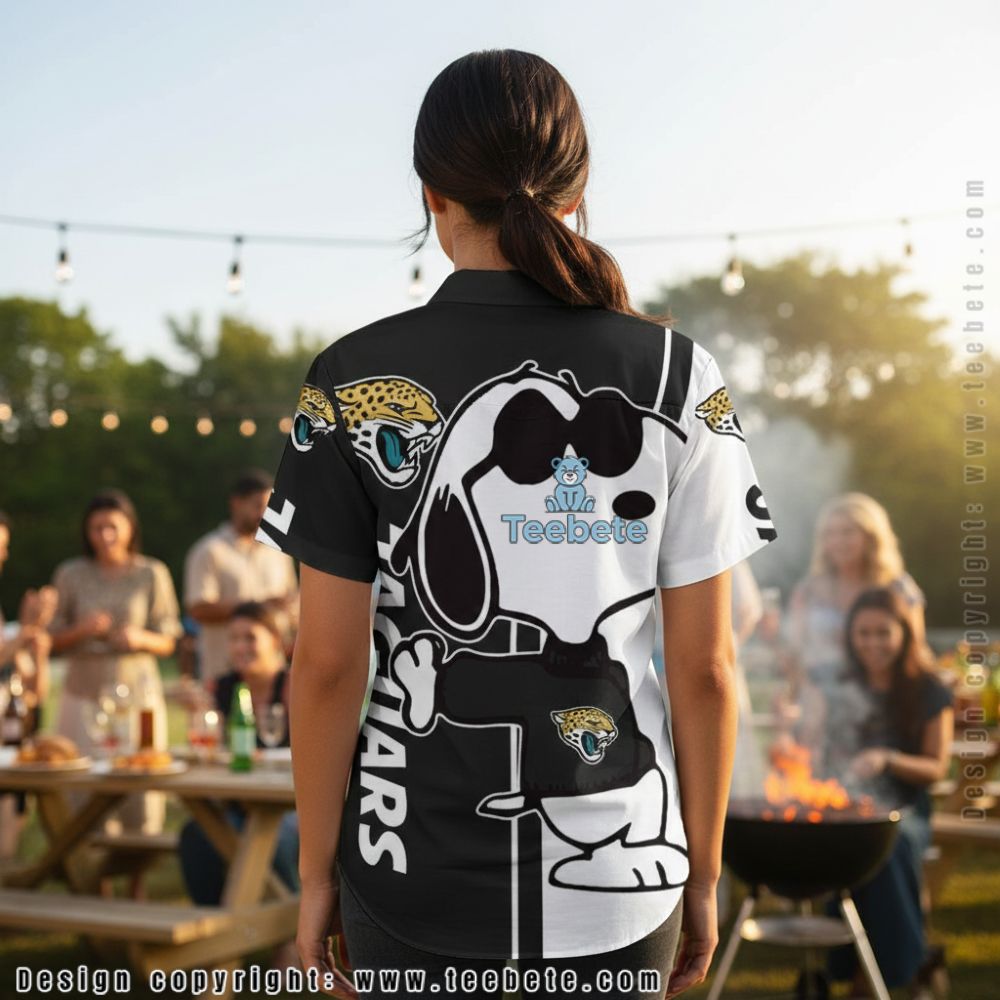 A beloved cartoon beagle in sunglasses strikes a cool pose on the Jacksonville Jaguars Snoopy Joe Cool Black White Hawaiian Shirt, rendered in bold black and white against contrasting color-blocked panels. The character appears prominently at the center in his signature relaxed stance, while “JAGUARS” text runs vertically down the side in white lettering. Team mascot logos position on both shoulders, creating sports branding alongside the pop culture icon. The design employs a split-panel composition with black sections on one side and white on the other, utilizing clean lines and high contrast for graphic impact. This Hawaiian shirt features sublimation printing across a camp collar button-front format, where the monochromatic color scheme keeps focus on the character illustration and team elements.