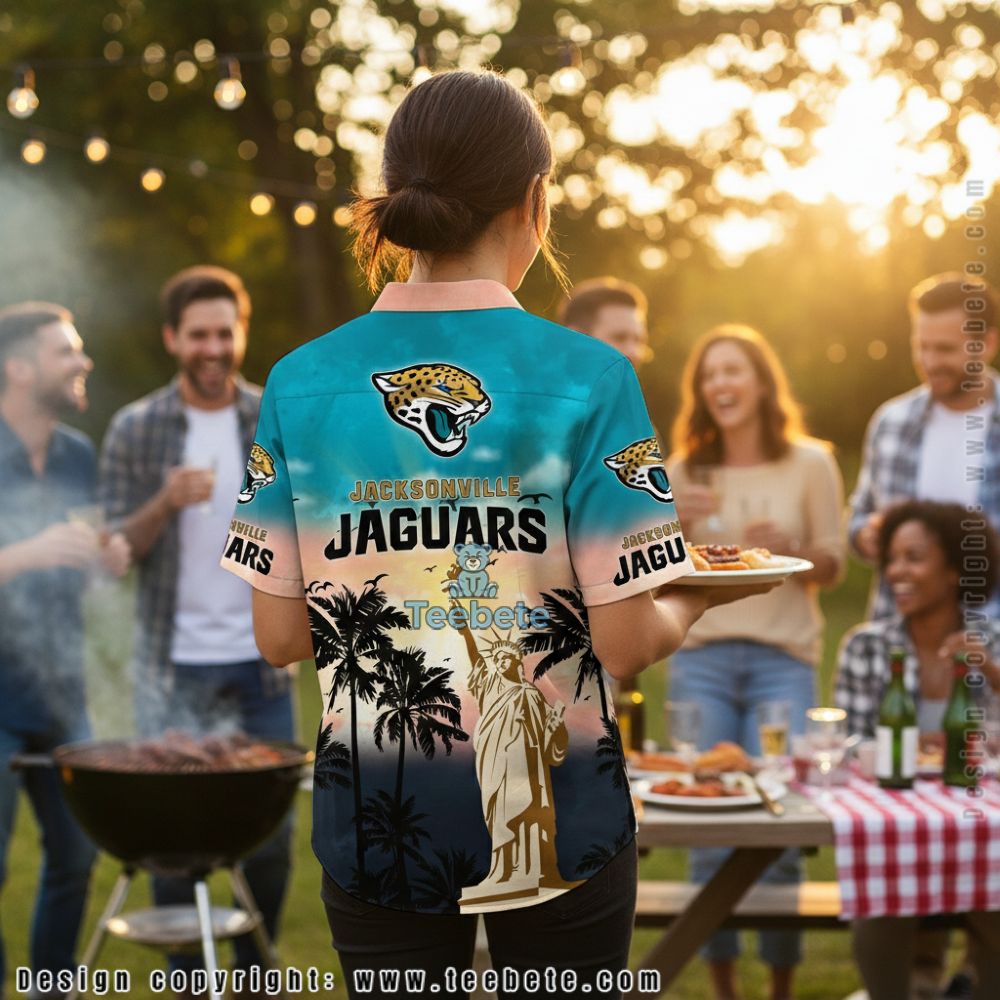 Sunset gradient colors transition from bright turquoise sky to deep navy ocean on the Jacksonville Jaguars Statue Of Liberty Sunset Tropical Hawaiian Shirt, creating a dramatic dusk atmosphere. The Statue of Liberty silhouette stands prominently in gold tones at the center, flanked by black palm tree silhouettes that frame the iconic monument. “JACKSONVILLE JAGUARS” text appears in bold black lettering across the chest, with team logos scattered on the shoulders and sleeves alongside “JACKSONVILLE JAGUARS” sleeve bands. The color palette flows smoothly from aqua blues through peach and coral sunset hues into darker twilight tones at the hem. This Hawaiian shirt utilizes gradient sublimation printing on a camp collar format, blending patriotic imagery with coastal scenery and team branding.