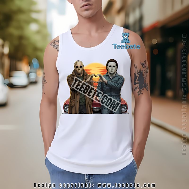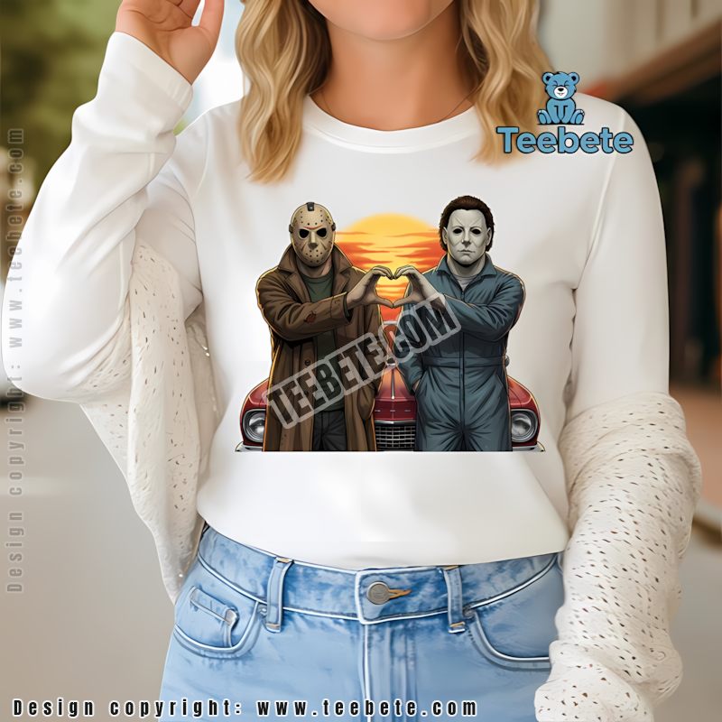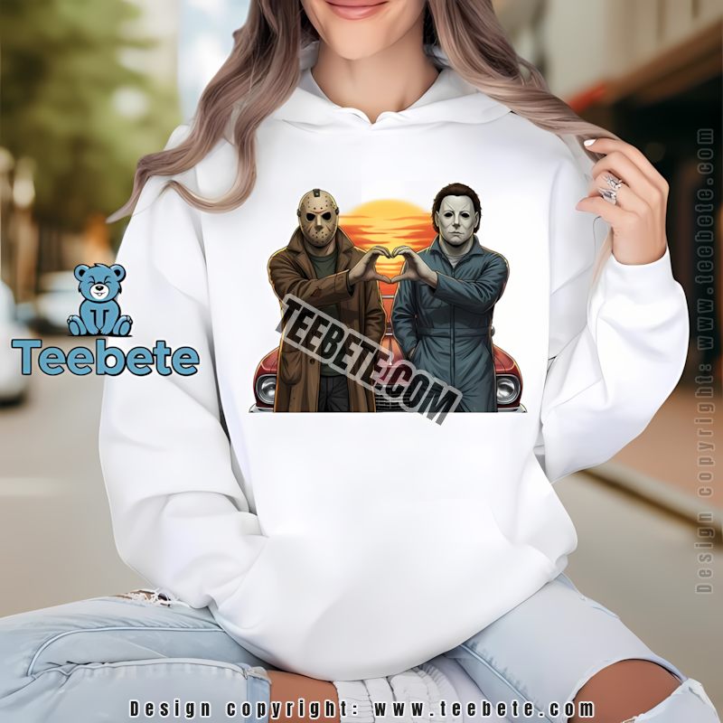 Embrace the Spirit of Legends with Our Jason Voorhees Michael Myers Heart Hand Sign Shirt