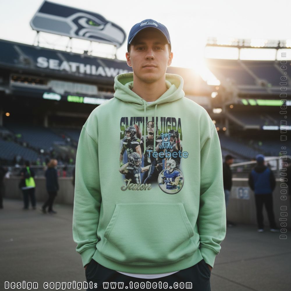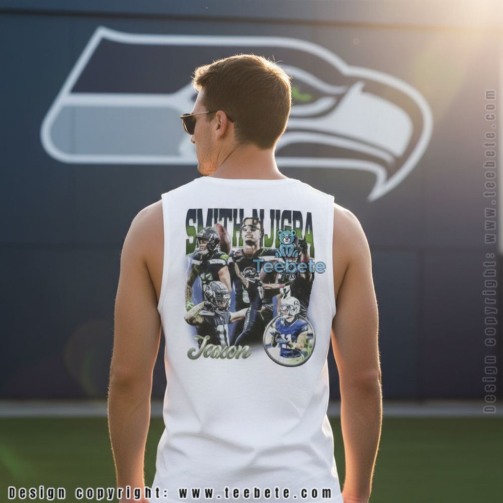 A fan-made tribute tee for Seattle supporters, this Jaxon Smith Njigba Seattle Player shirt showcases a dynamic photo collage capturing key moments from the wide receiver’s game highlights. The design features “SMITH-NJIGBA” in bold lettering across the top with action shots arranged in an engaging layout, complemented by the player’s name “Jaxon” in stylized script. Shown in forest green, this independently designed apparel is also available in multiple colors including team shades and neutrals.