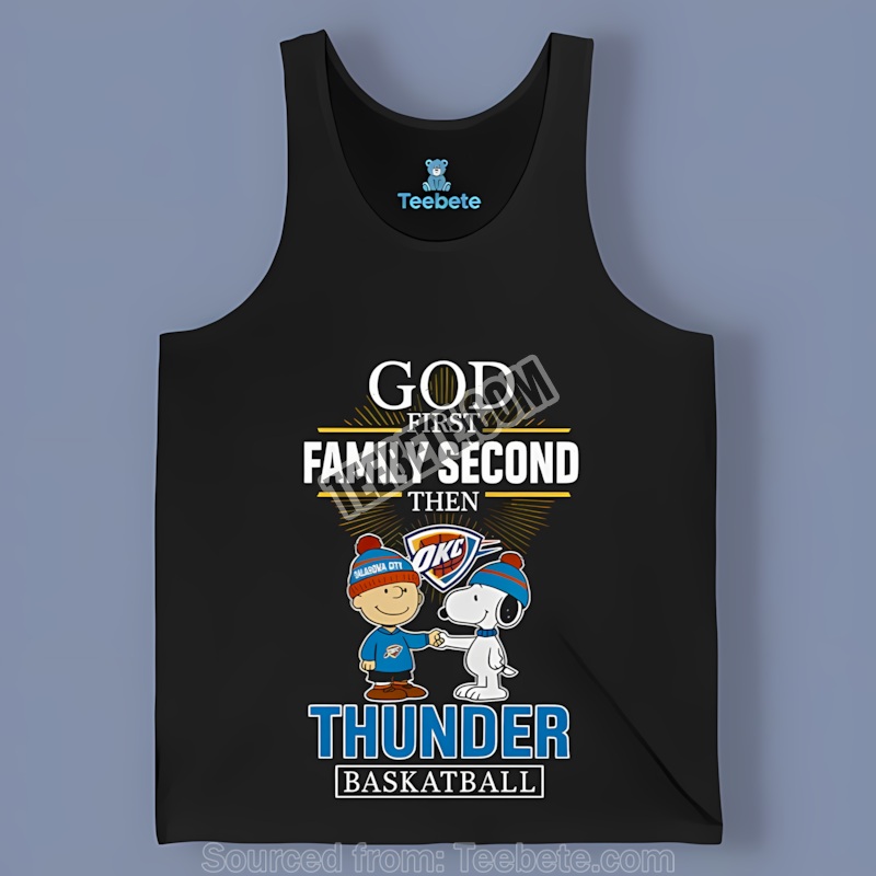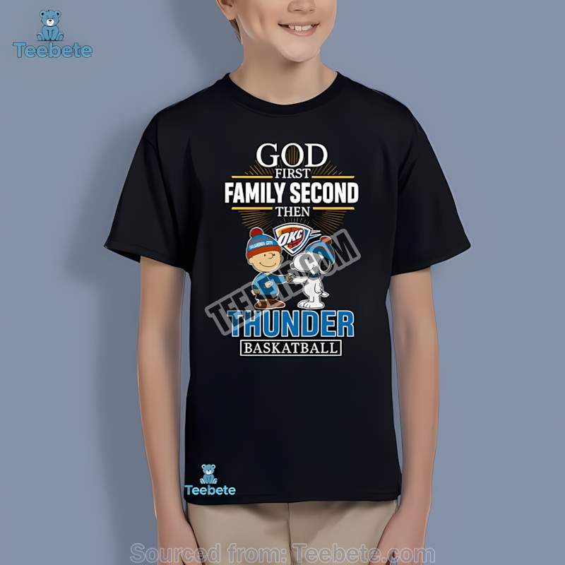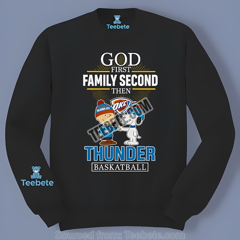 Unleash your faith and fandom with this Jesus Oklahoma City Thunder Snoopy Charlie Brown God First Family Shirt from Teebete. This unique design beautifully blends your love for the Oklahoma City Thunder, the iconic Peanuts gang, and your unwavering faith.