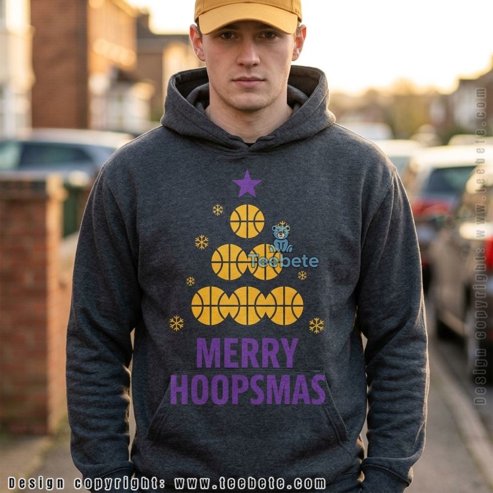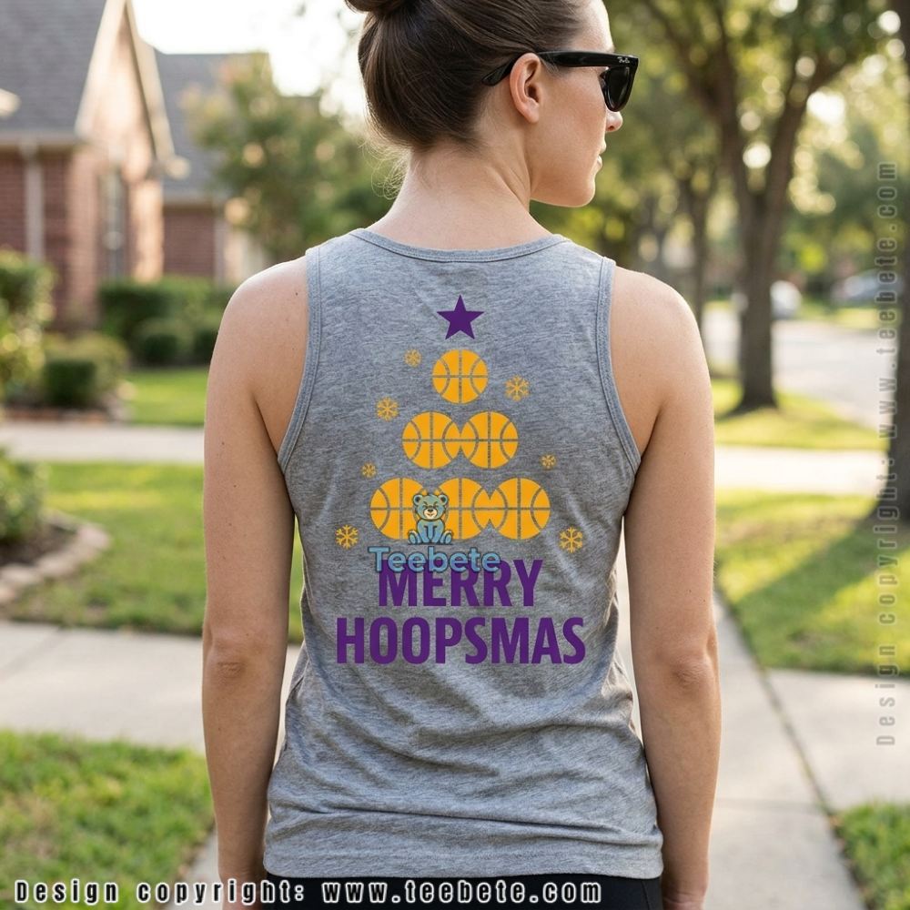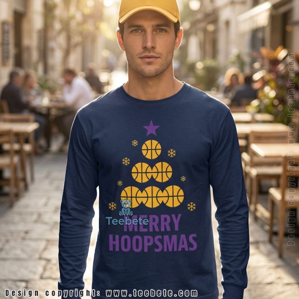 Rich purple serves as the foundation for the LA Basketball Fan Christmas Holiday Gift Purple Gold Shirt, where dynamic graphics celebrate the spirit of basketball during the festive season. Golden accents are interspersed throughout, depicting basketball motifs and whimsical holiday elements that create a cheerful contrast against the deep ground color. The design employs a thoughtful distribution of graphics, with more concentrated imagery across the chest area that draws the eye, while leaving the sleeves and hem feeling open and unencumbered.