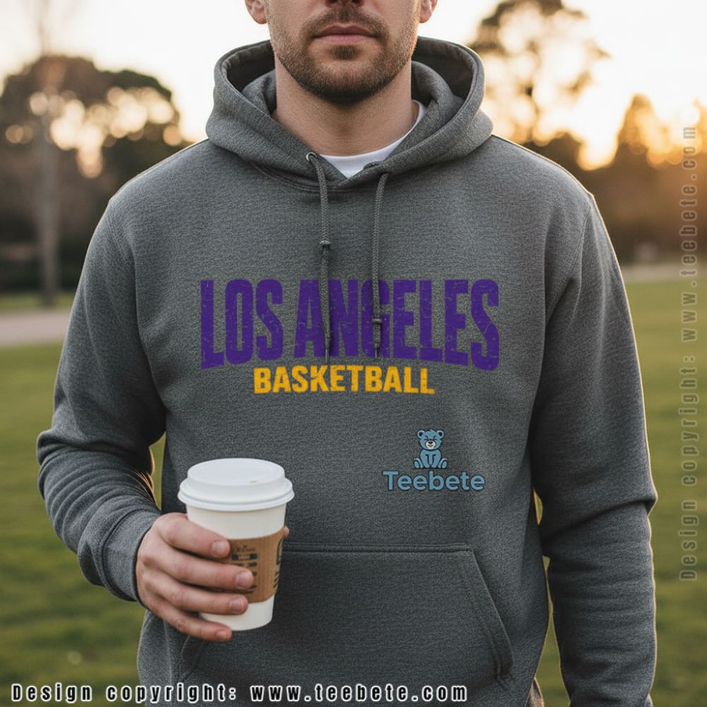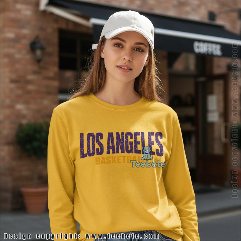 Vibrant purple hues form the foundation of the LA Basketball Purple Gold Heavy Distressed Vintage Fan Shirt, where distressed textures interact with bold golden lettering that captures the essence of team loyalty. The large graphic spans across the chest, presenting a striking contrast that evokes the energy of game day. Varying line thicknesses within the text and imagery create a dynamic visual hierarchy, while strategically placed open space around the design elements ensures the overall composition remains engaging and not overly crowded.