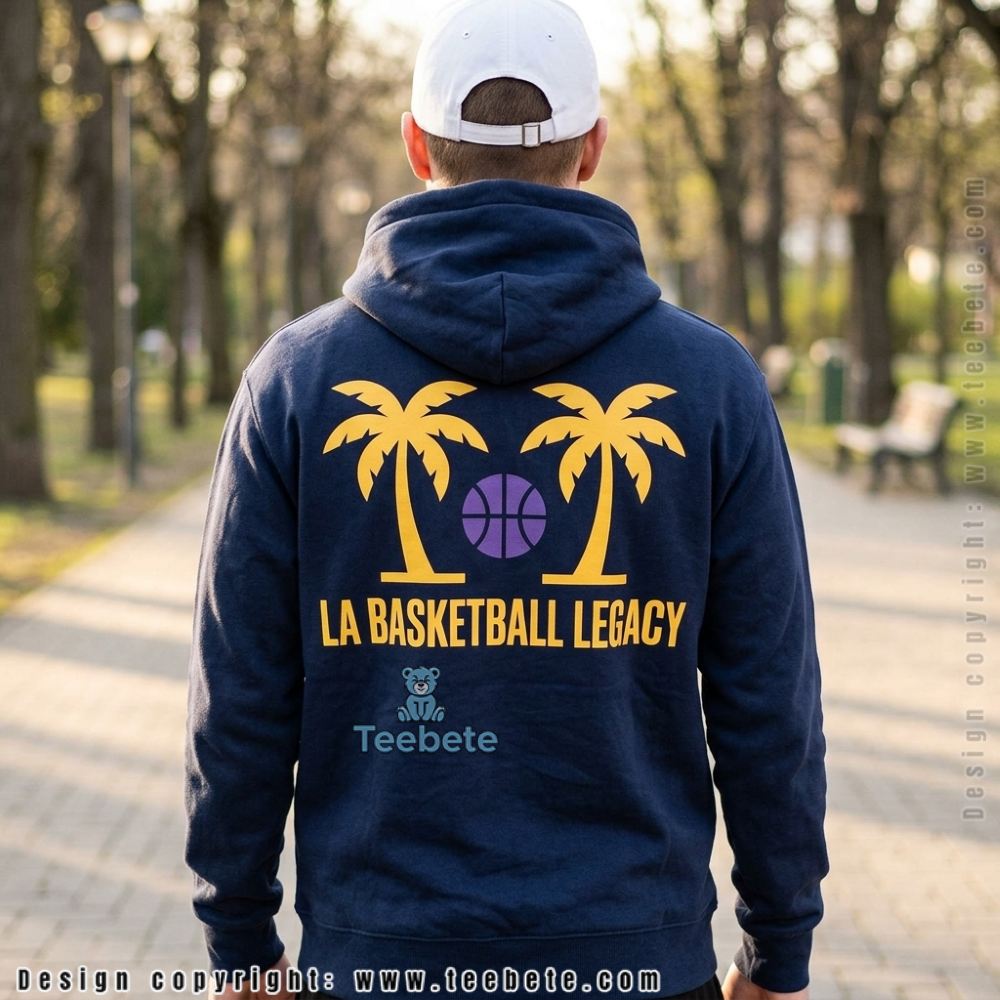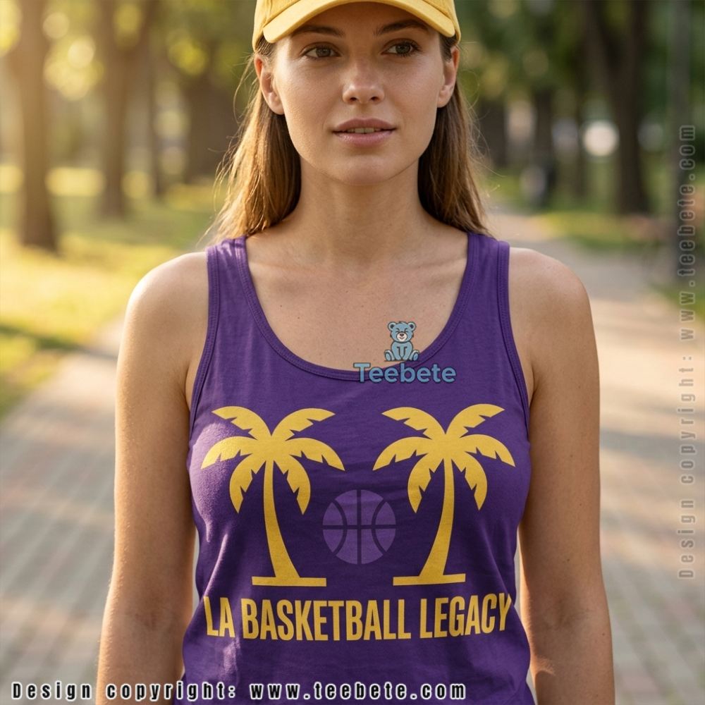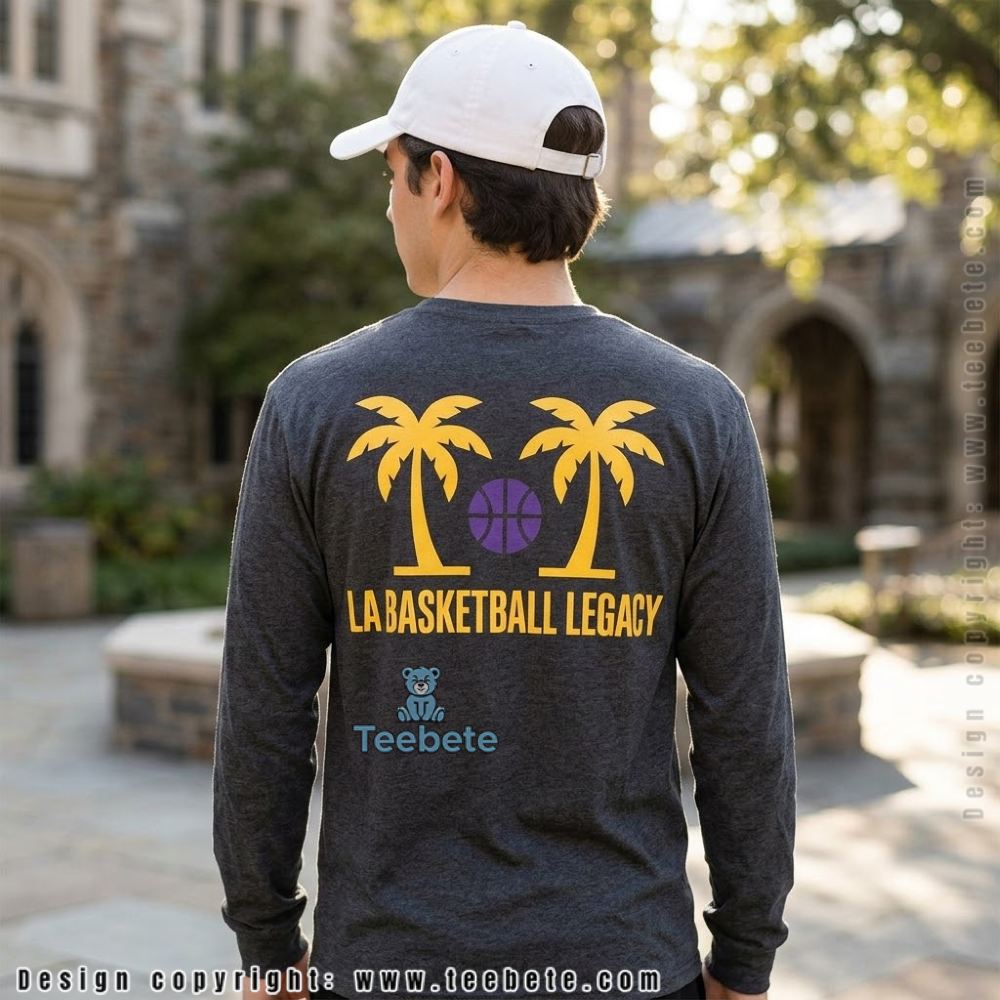 Against a soft purple base, the LA Basketball Sunset Palm Tree Purple Gold Shirt features an intricate design that harmonizes palm tree silhouettes with a striking sunset motif, using a warm palette of golds, oranges, and pinks. The palm trees, stylized yet recognizable, rise gracefully, creating a sense of movement that guides the eye across the shirt’s surface. Print density is highest around the central chest area, gradually thinning out toward the edges, ensuring a balanced visual weight that draws attention to the torso while leaving breathing space around the arms and collar.