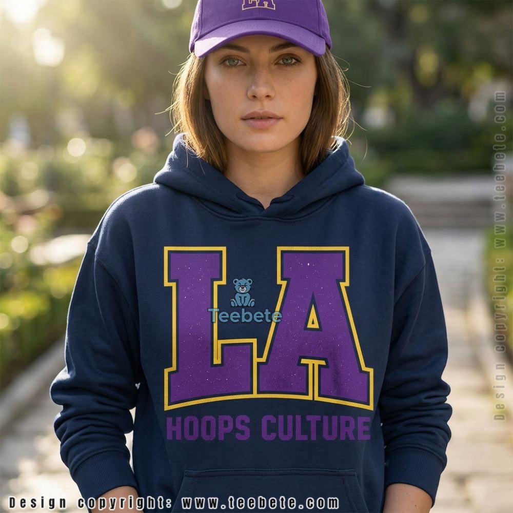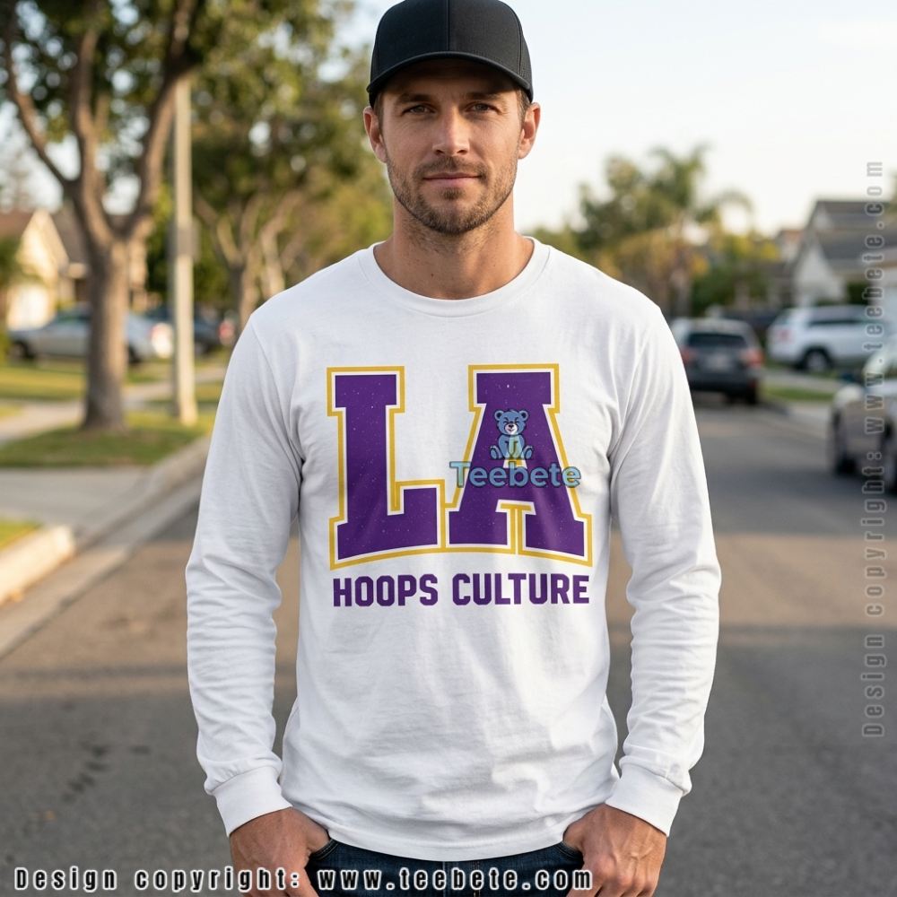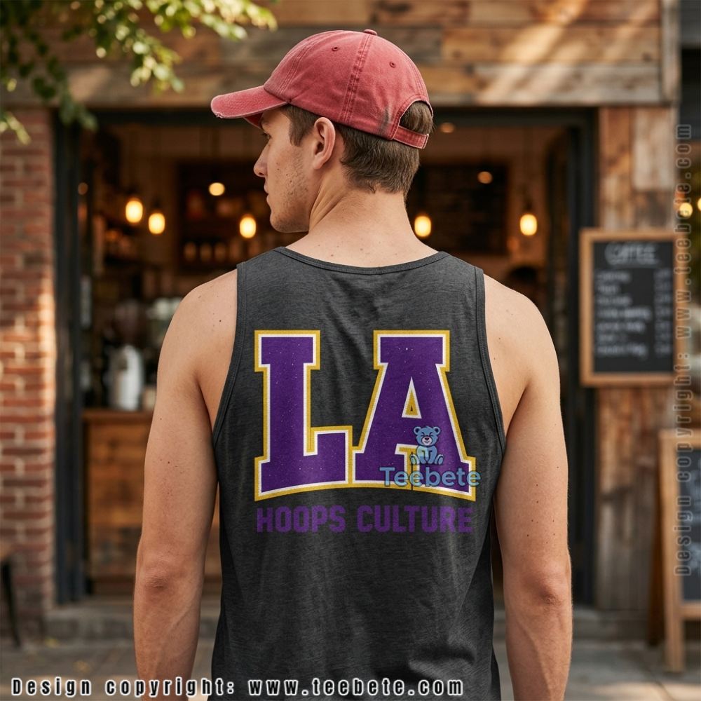 Purples and golds create a striking visual dynamic in the LA Hoops Purple Gold Block Letter Culture Shirt from Teebete. The background is a bold purple hue that serves as a dramatic canvas for the oversized gold block letters that spell out the brand’s name, capturing attention through their clean, graphic presentation. This design features varying letter weights and heights, establishing a lively hierarchy that guides the eye across the shirt. The color contrast enhances the overall visual impact, ensuring the message stands out prominently, while careful use of space prevents the graphic from feeling overcrowded.
