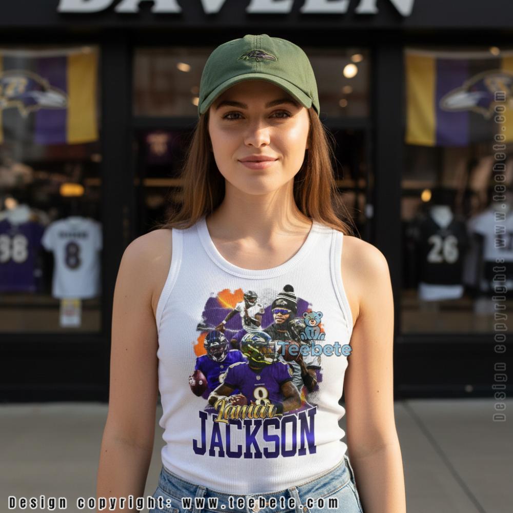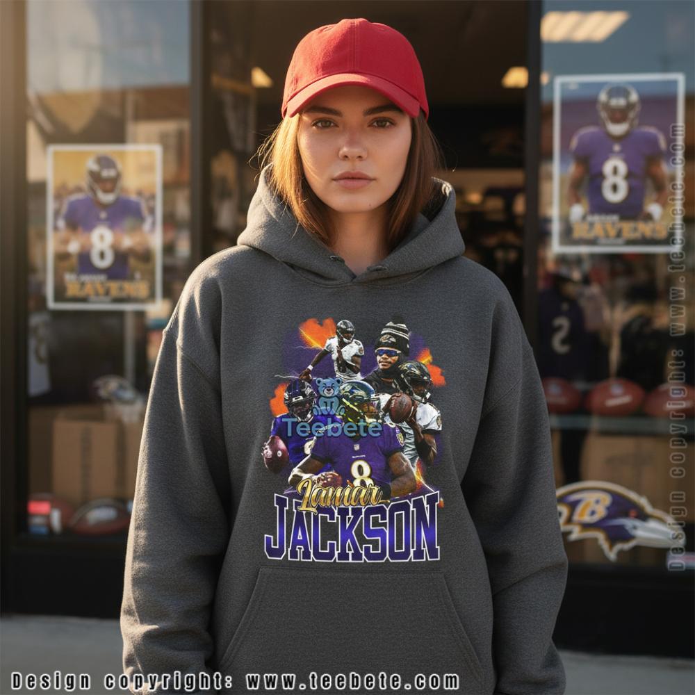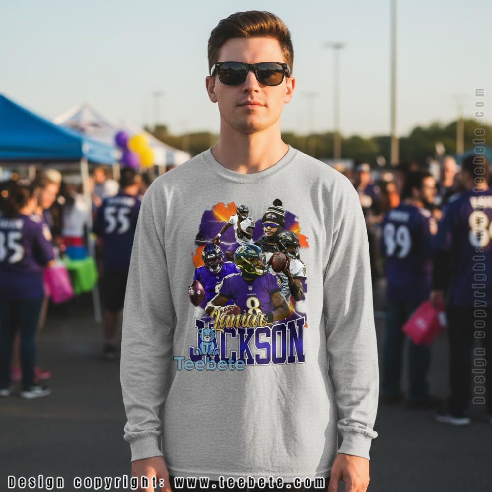The multi-image approach captures the full spectrum of Jackson’s electrifying game, from pocket passing to scrambling runs that leave defenders grasping at air. Perfect for honoring the MVP quarterback’s historic performances, game day wear, or everyday celebration of Baltimore’s franchise cornerstone, this design offers comprehensive visual tribute. The vintage styling adds throwback appeal to contemporary player worship, giving Ravens fans a distinctive way to showcase their appreciation for Lamar’s game-changing talent through photographic storytelling that celebrates every dimension of his revolutionary quarterback play.
