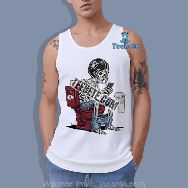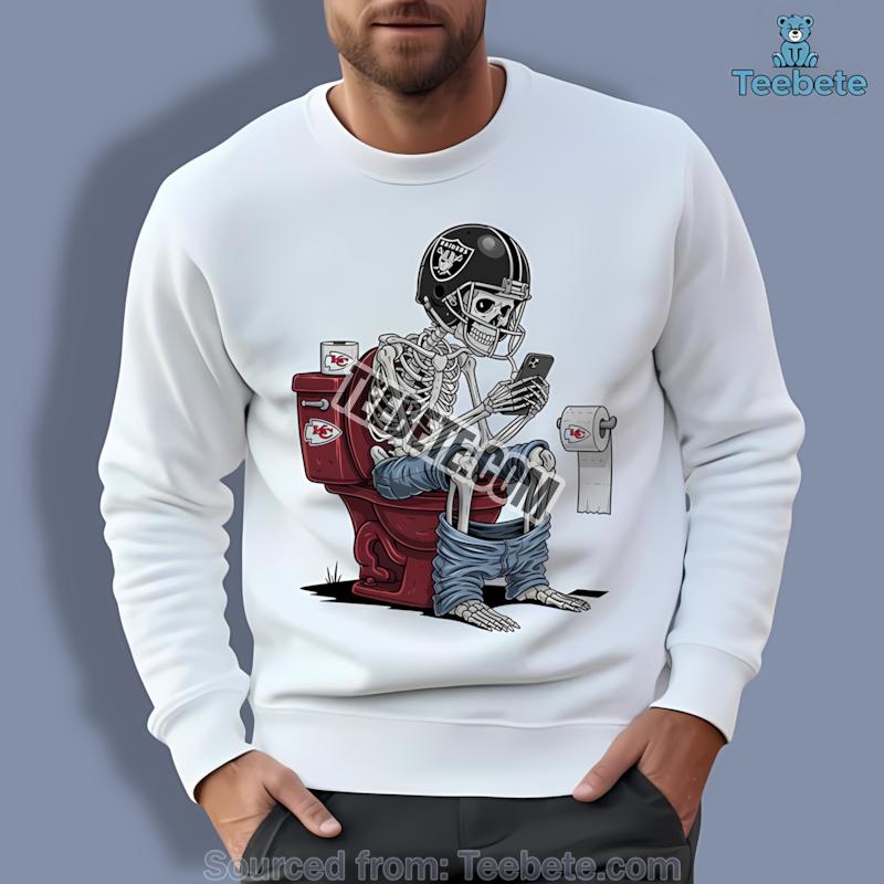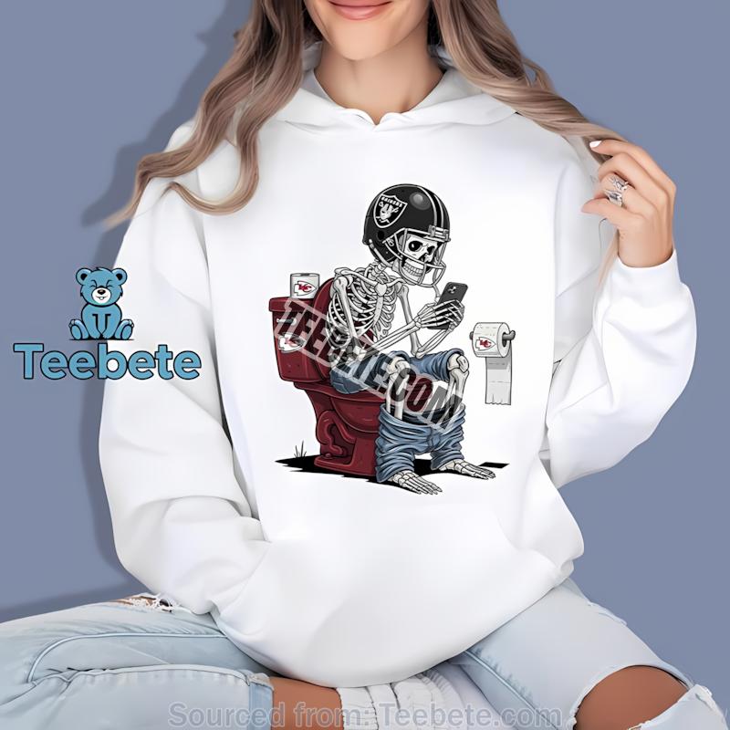 Showcasing a bold graphic of a skeleton on a toilet, this Raiders fan rivalry shirt stands out from the crowd. The eye-catching design is crafted using high-quality inks that resist fading, ensuring that your passion for the Raiders shines brightly through every wash. The vivid print serves as a conversation starter and a way to share your love for the game, making it an essential piece for your collection of Raiders and Chiefs rivalry clothing.