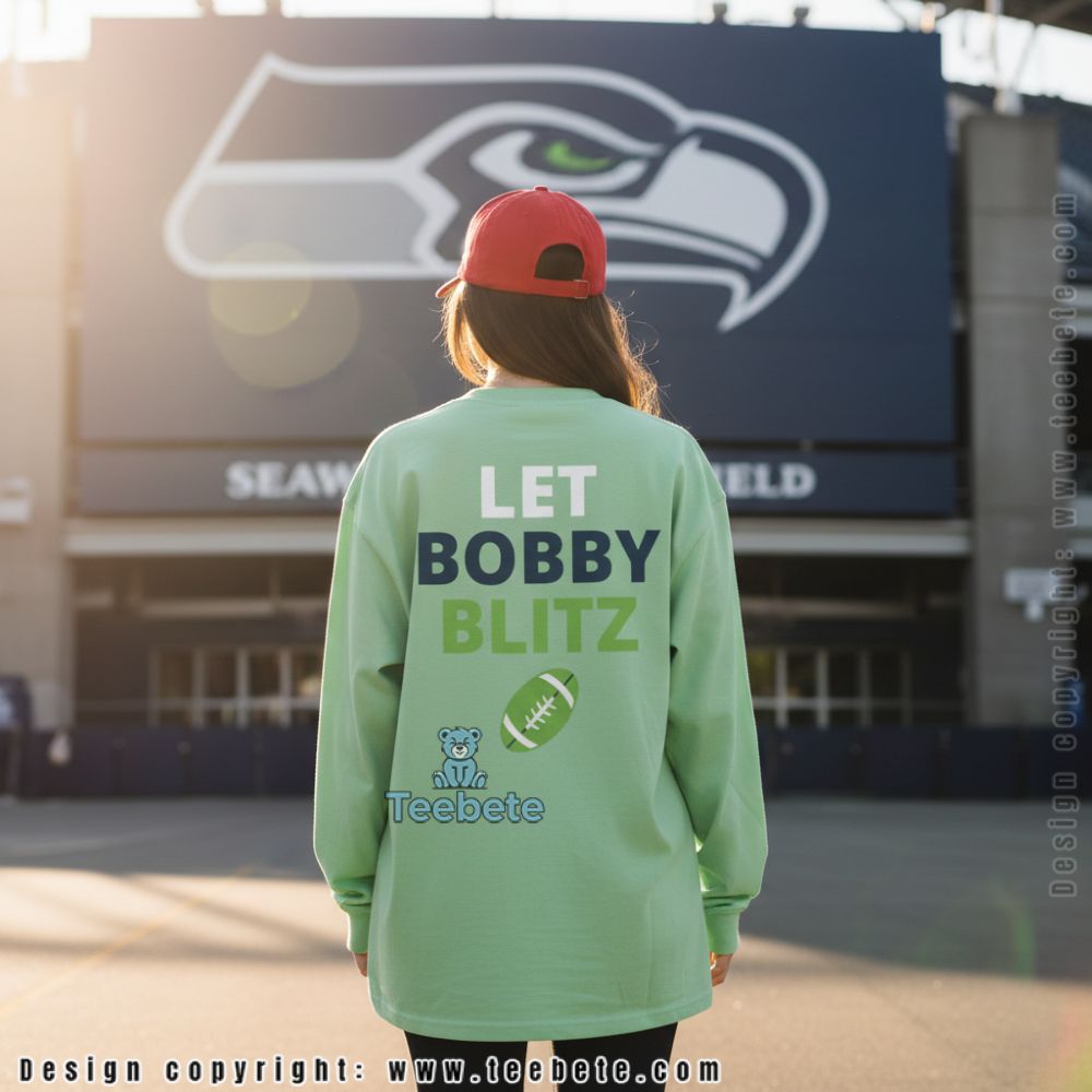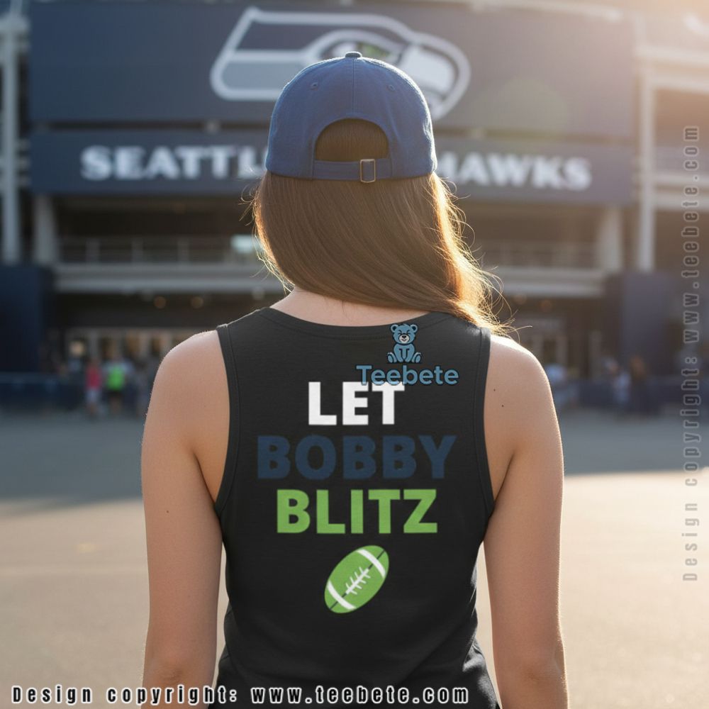 Defensive fans know the power of a well-timed blitz, and this shirt celebrates that aggressive mentality. The front features “LET BOBBY BLITZ” in bold lettering with navy and vibrant green text alongside a football graphic, referencing the linebacker’s game-changing ability to disrupt opposing offenses. It’s designed for supporters who appreciate defensive dominance and the players who deliver it.