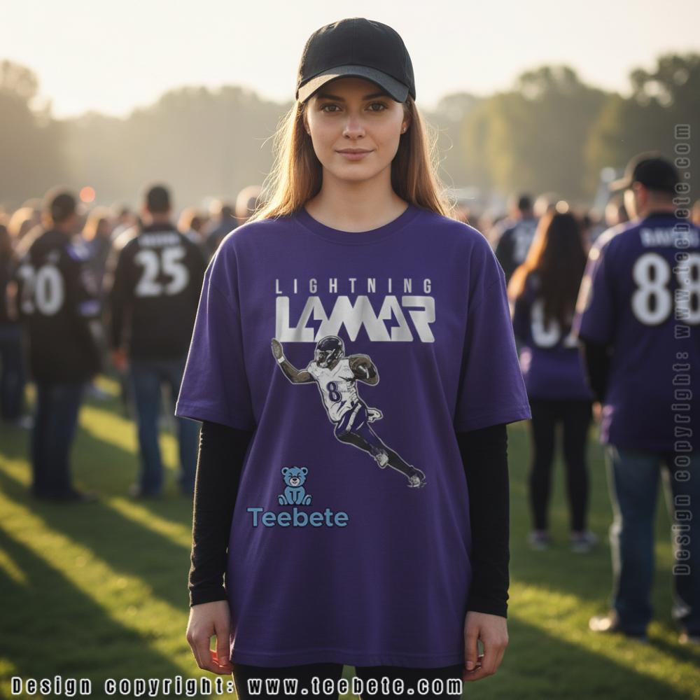 “LIGHTNING LAMAR” appears in bold white and stylized lettering across the chest, with the quarterback’s jersey number 8 integrated into the dynamic typography design. Below the text, Lamar Jackson is captured mid-celebration pose wearing his white Ravens uniform, the illustration rendered in detailed line art with purple accent shading. The Lightning Lamar Jackson Baltimore Ravens 8 Purple Lightning Shirt showcases the electrifying player pointing skyward in his signature touchdown celebration stance, his athletic form conveying the explosive speed that earned him the “Lightning” nickname. The navy blue fabric provides solid backdrop that allows the white text and illustration to stand out with clear visibility, while subtle purple highlights throughout the design honor team colors. Centered graphic placement on the front panel delivers the player tribute through classic crew neck t-shirt construction with straightforward layout celebrating Baltimore’s dynamic quarterback.