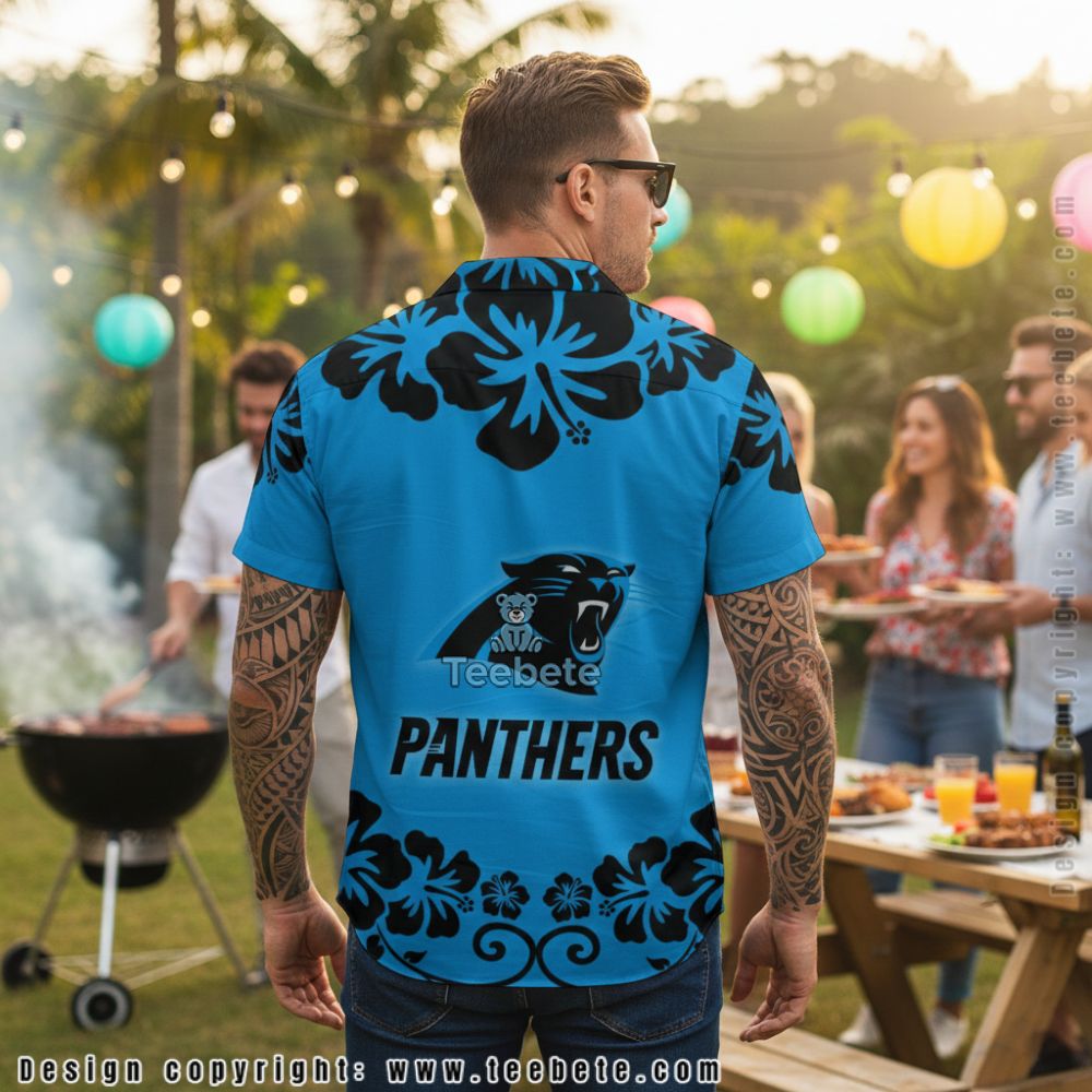 Beloved animated characters take center stage on the Lilo and Stitch Carolina Panthers Tropical Floral Hawaiian Shirt, positioned against a bright azure background adorned with black hibiscus silhouettes. The duo appears prominently at the chest, with the blue alien character holding his ukulele alongside his companion in her signature red outfit. Bold “PANTHERS” text anchors the composition below the characters, while Panthers logos frame the design on both sides. Large tropical hibiscus flowers in black create striking contrast across the shoulders and hem, featuring decorative swirl patterns that enhance the island aesthetic. This Hawaiian shirt employs sublimation printing with a traditional camp collar and button-front styling, ensuring the graphics wrap seamlessly around the garment for complete coverage from front to back.