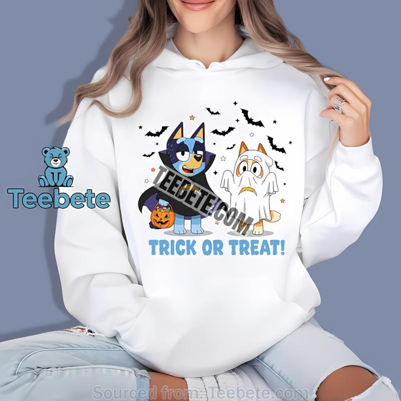 Inspiration often strikes in the form of cherished memories and beloved characters. Picture a Halloween night filled with laughter, excitement, and a sprinkle of nostalgia, where kids dressed as their favorite characters embark on their quest for candy. Our Los Angeles Chargers Bluey Bingo Trick Or Treat Halloween Color Shirt draws from that festive spirit, combining the thrill of trick-or-treating with the passion of being a die-hard Chargers fan. Imagine the glowing jack-o’-lanterns and the vibrant, colorful celebrations that come with every Halloween, and now picture wearing that joy as you represent your favorite team.