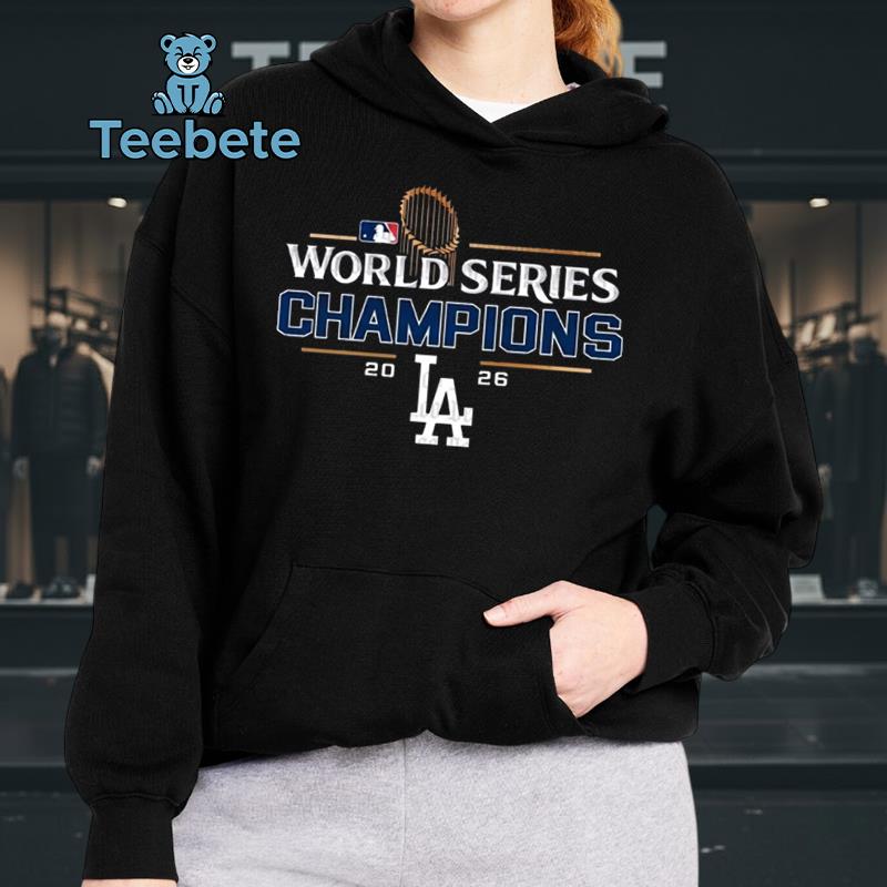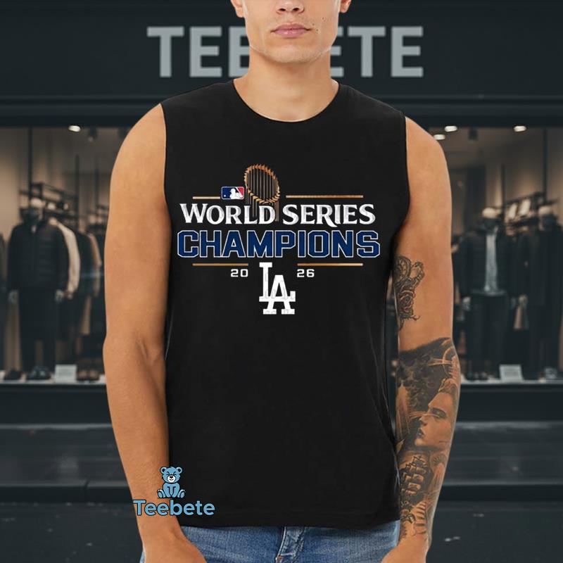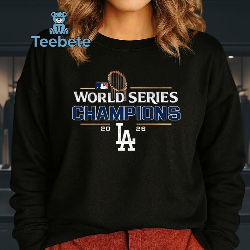 Eye-catching typography dominates the front of the T-Shirt, capturing the triumphant spirit of the Los Angeles Dodgers with the phrase “2026 World Series Champions” prominently emblazoned across the chest. The design employs a layered collage layout, blending team colors with striking graphics that convey excitement and victory. Rich blues and classic whites create a sharp contrast against a neutral background, enhancing the overall vibrancy of the shirt. Each detail in the artwork is thoughtfully arranged to ensure that this 2026 World Series Champions Los Angeles Dodgers T-Shirt stands out in any setting.