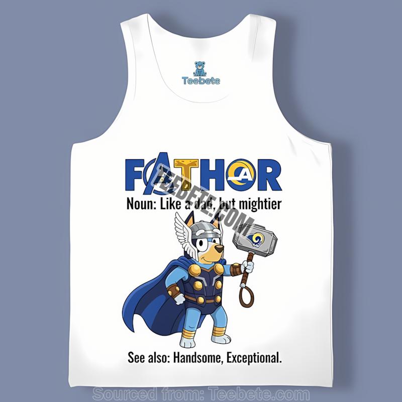 Crafted by Teebete, known for their high-quality graphics and unique designs, this Rams Bluey themed mens tee stands out in any fan’s closet. The vibrant colors and playful graphics make it an attention-grabber, providing a cheerful twist to your fan apparel. Made from soft, breathable fabric, this LA Rams graphic tshirt for dad is perfect for all-day wear, ensuring you stay comfortable as you root for the team.