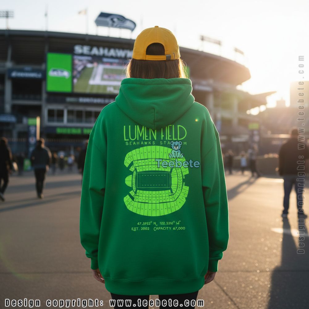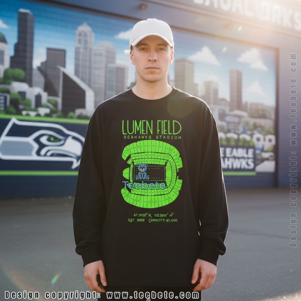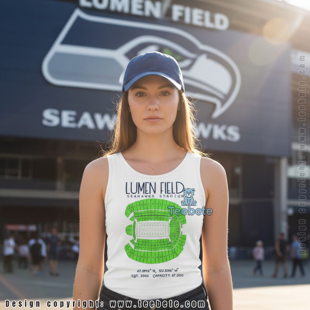 A fan-inspired tee designed for Seattle supporters, this Lumen Field Seahawks Stadium shirt features the stadium name in bold green lettering above a detailed seating chart graphic. The design includes precise geographic coordinates (47.5952° N, 122.3316° W), the established date of 2002, and the stadium’s 67,000 capacity. Shown in navy, this cotton tee is also available in multiple colors including team shades and neutrals, letting fans represent their connection to one of the NFL’s most iconic venues.