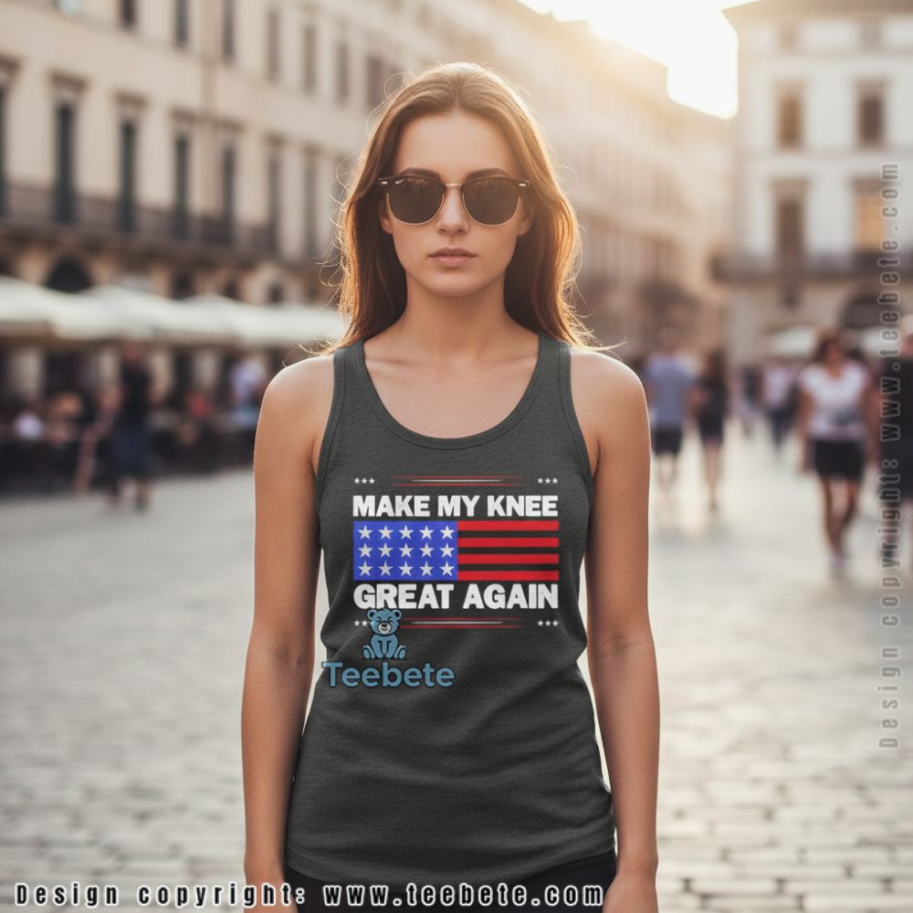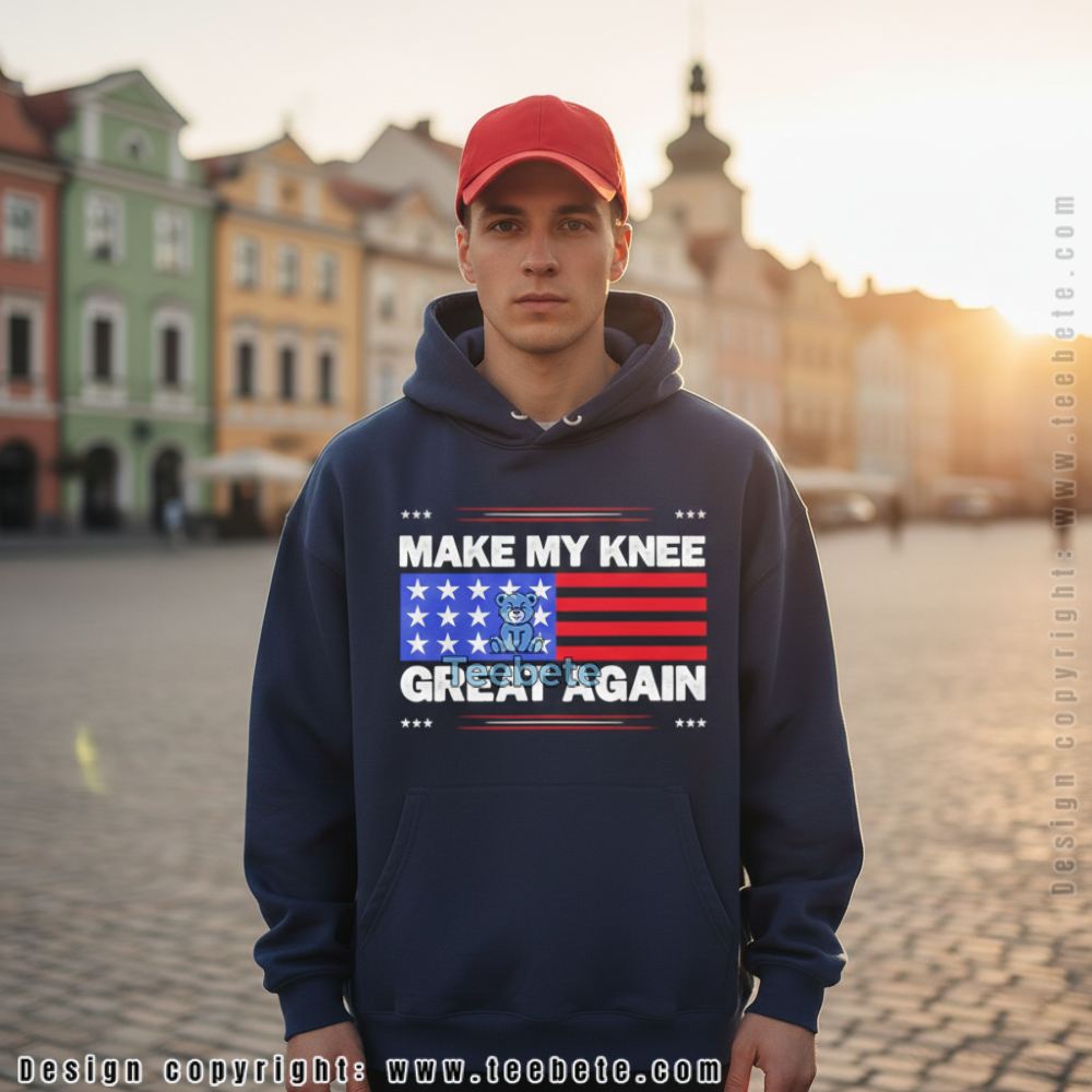 The humorous slogan “MAKE MY KNEE GREAT AGAIN” is printed in clean, white block lettering, flanking the flag for a balanced and impactful look.