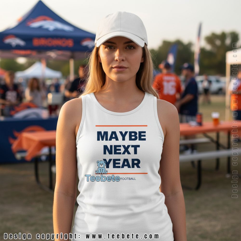 The crisp white background creates maximum impact for the bold typography. Navy blue “MAYBE NEXT YEAR” dominates the center, flanked by orange horizontal lines that add team color without overwhelming the minimalist aesthetic. “DENVER FOOTBALL” appears below in smaller text, grounding the message in geographic pride. It’s the kind of straightforward design that works anywhere – from the stadium to the sports bar to casual weekend wear.