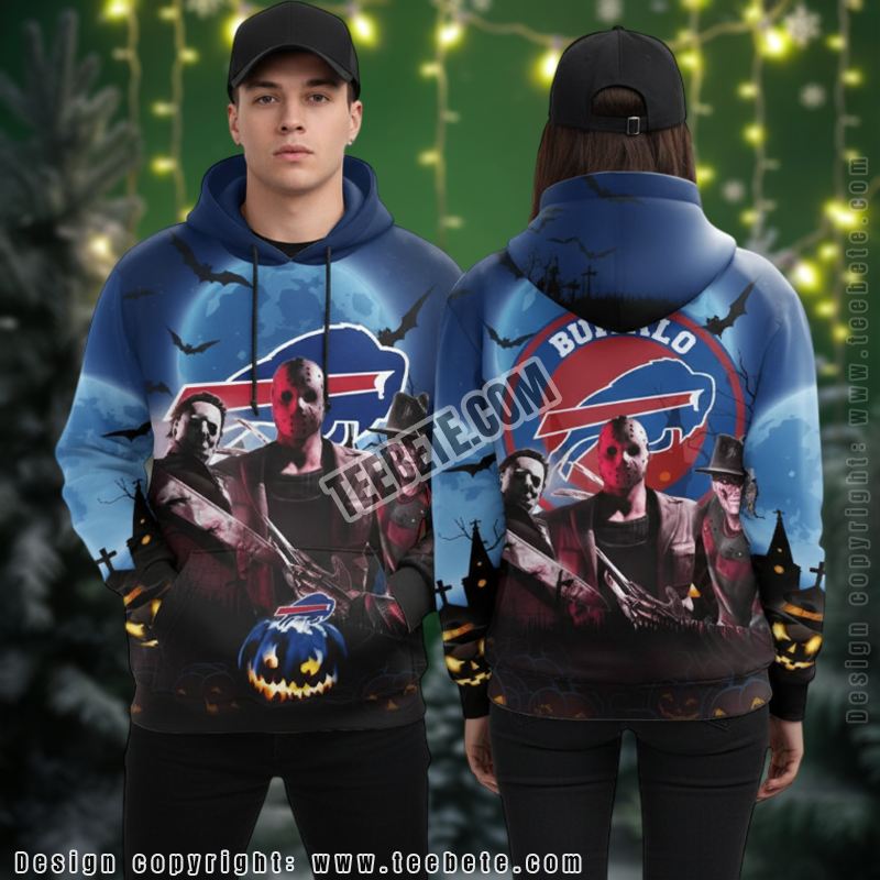 Embrace your love for the iconic horror genre with the Buffalo Bills Michael Myers Jason Voorhees 3D Hoodie Printed Blue. This extraordinary design brings together the chilling vibes of two legendary characters, making it a must-have for fans and collectors alike. Show off your passion for iconic horror movies in style with this unique piece.