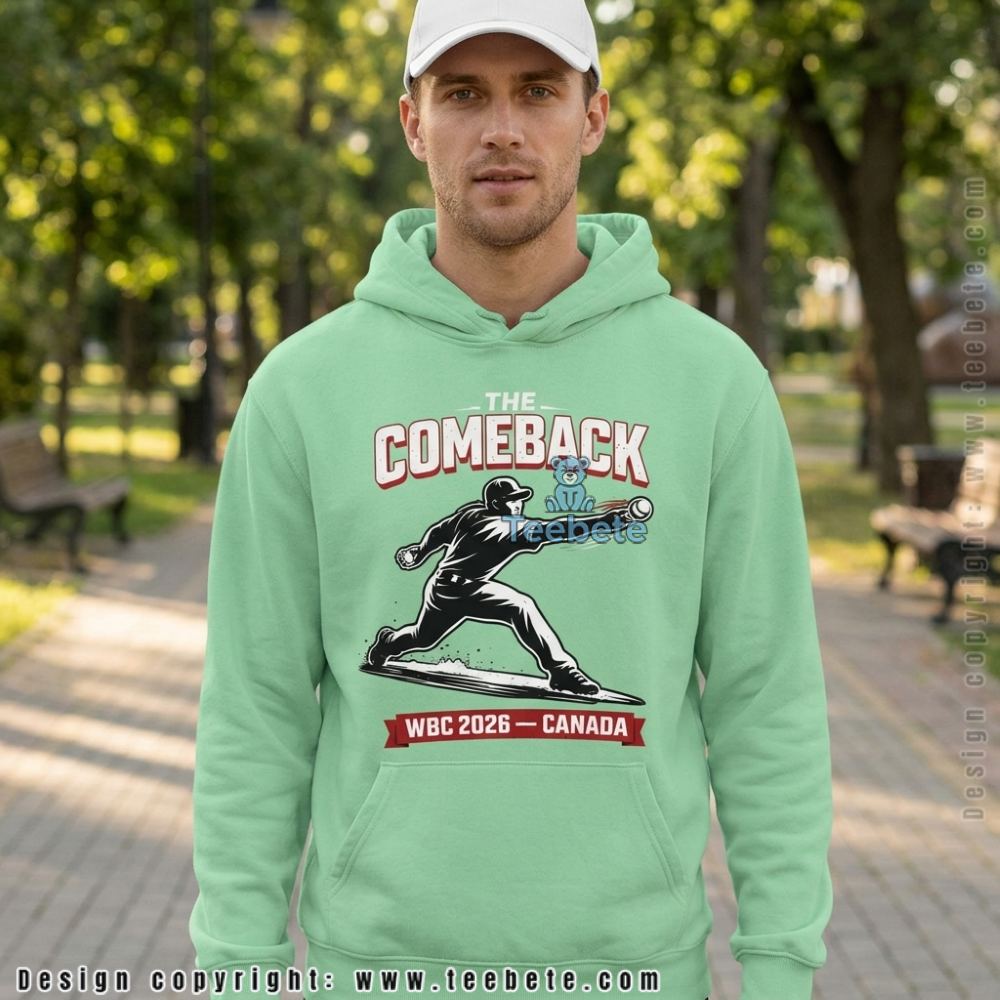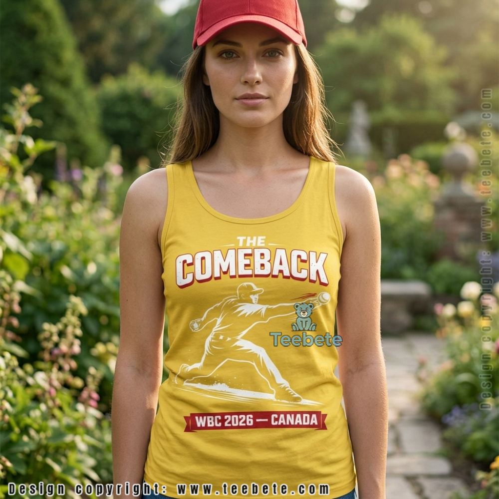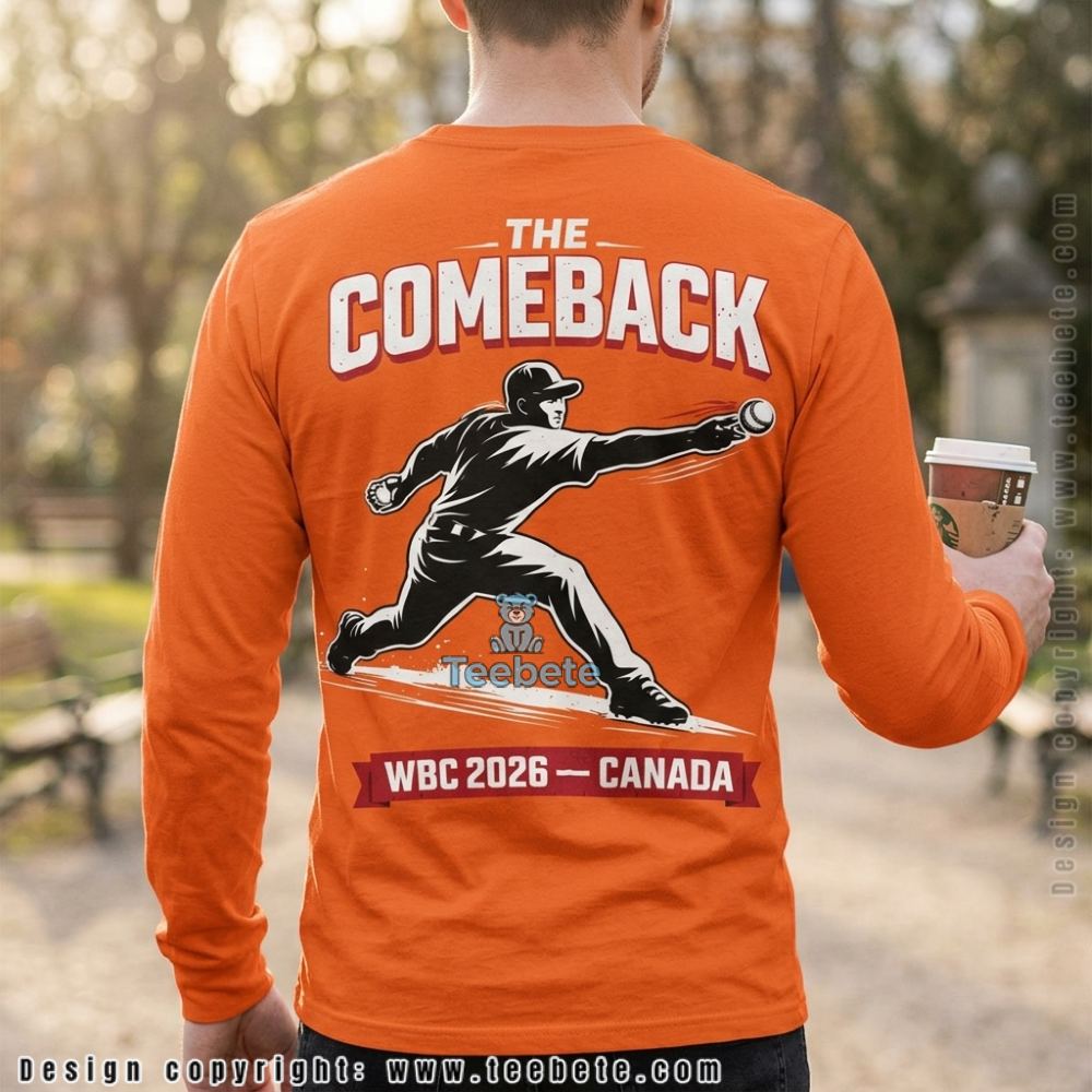 Illustrative in character, this shirt draws upon the tradition of sports graphics, emphasizing precise linework and contrasting color relationships to capture attention. Each element is rendered with distinct clarity, allowing for a lively interplay between the vibrant reds and deep blues that take center stage, while the white background enhances the colors, preventing overcrowding. As the viewer engages with the design, the energetic arrangement of the pitcher and accompanying motifs creates a cohesive visual narrative that resonates with the spirit of the WBC.