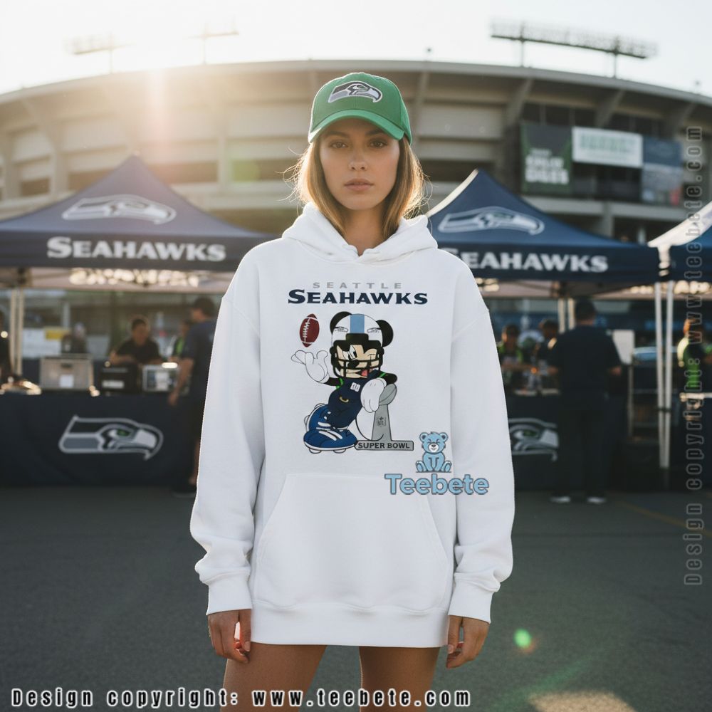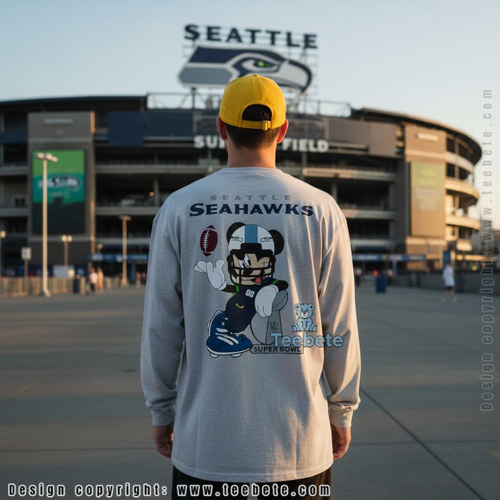 A fan-made design for Seattle supporters, this Mickey Mouse Seattle Seahawks Super Bowl shirt combines classic cartoon styling with championship pride. The design features an animated character dressed in team gear holding a football and helmet, with “SEATTLE SEAHAWKS” displayed prominently above and “SUPER BOWL” anchoring the bottom. Shown in black, this independently designed cotton tee is also available in multiple colors including navy, sport grey, and team shades.