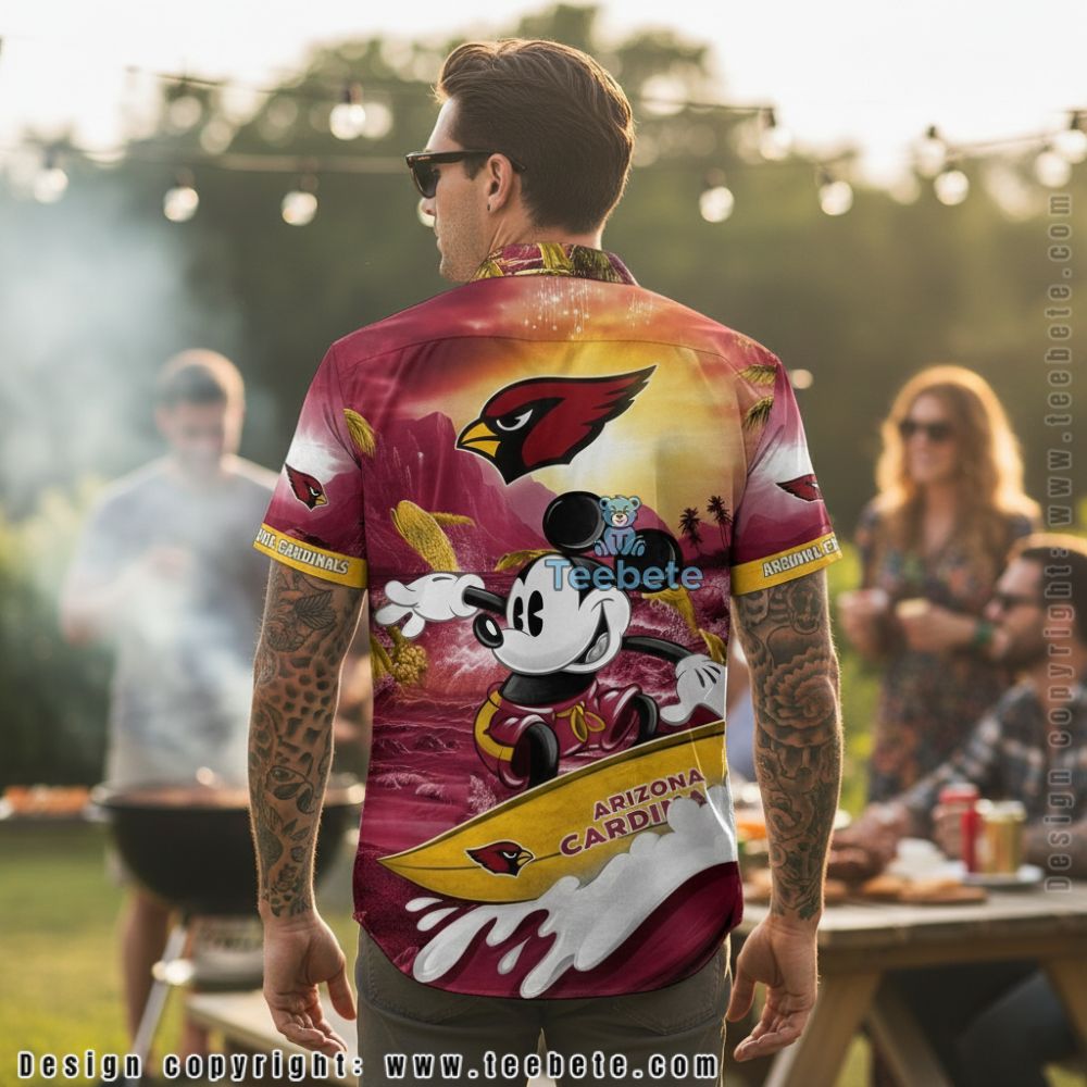 Embrace the vibrant spirit of summer with the Mickey Mouse Surfing Arizona Cardinals Hawaiian Shirt. The design features a kaleidoscope of vivid colors, showcasing a playful layout where iconic Mickey Mouse rides the waves, seamlessly blended with the Arizona Cardinals’ emblems. The full-coverage, all-over print technique brings the graphics to life, offering an eye-catching contrast against a backdrop that evokes sunny beach days. Bold surf motifs intertwine with whimsical elements for a lively visual effect.