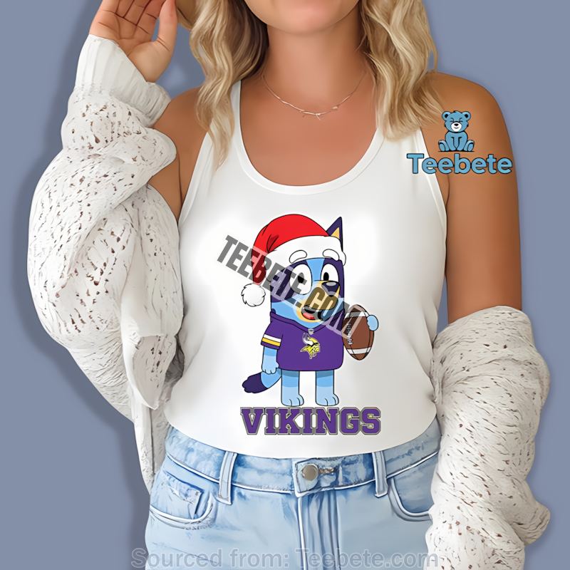 Available in various styles such as hoodies, men’s tank tops, women’s tank tops, unisex long sleeves, sweatshirts, and v-necks, there’s a perfect fit for everyone in the family. A standout item in any Vikings fan’s wardrobe, this Vikings Christmas Bluey fan shirt not only radiates style but also embodies your commitment to the team during the holiday season. The inclusion of Christmas elements like Santa hats brings a playful vibe, making it a must-have for decked-out game days or holiday parties.