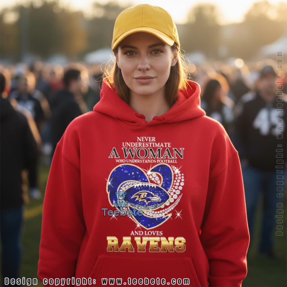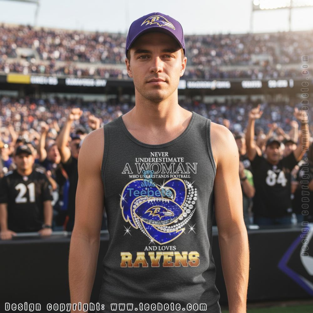 “NEVER UNDERESTIMATE A WOMAN WHO UNDERSTANDS FOOTBALL” appears in white lettering above an ornate heart design on this empowerment t-shirt, with sparkly embellishments creating glamorous texture throughout the composition. The decorative heart features deep blue coloring adorned with rhinestone-like details and pearl accents, cradling the Ravens logo at its center in team colors of purple, gold, and white. “AND LOVES RAVENS” completes the message below the heart in bold gold lettering that shimmers with metallic finish. The Never Underestimate A Woman Who Loves Ravens Tee showcases this feminine yet fierce declaration centered on navy blue fabric, with stars scattered around the embellished heart adding extra sparkle. The combination of elegant jewelry-inspired graphics with assertive messaging creates a design that celebrates both football knowledge and female fandom. Classic crew neck construction with centered graphic placement delivers the empowerment statement through straightforward t-shirt layout.